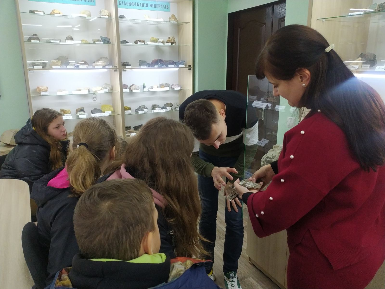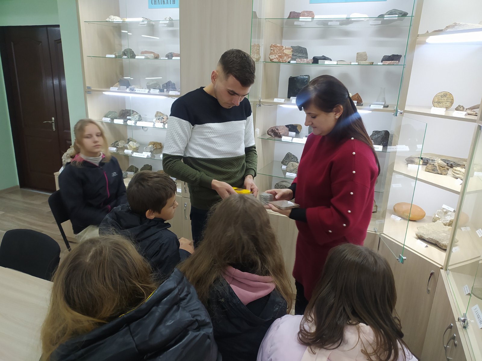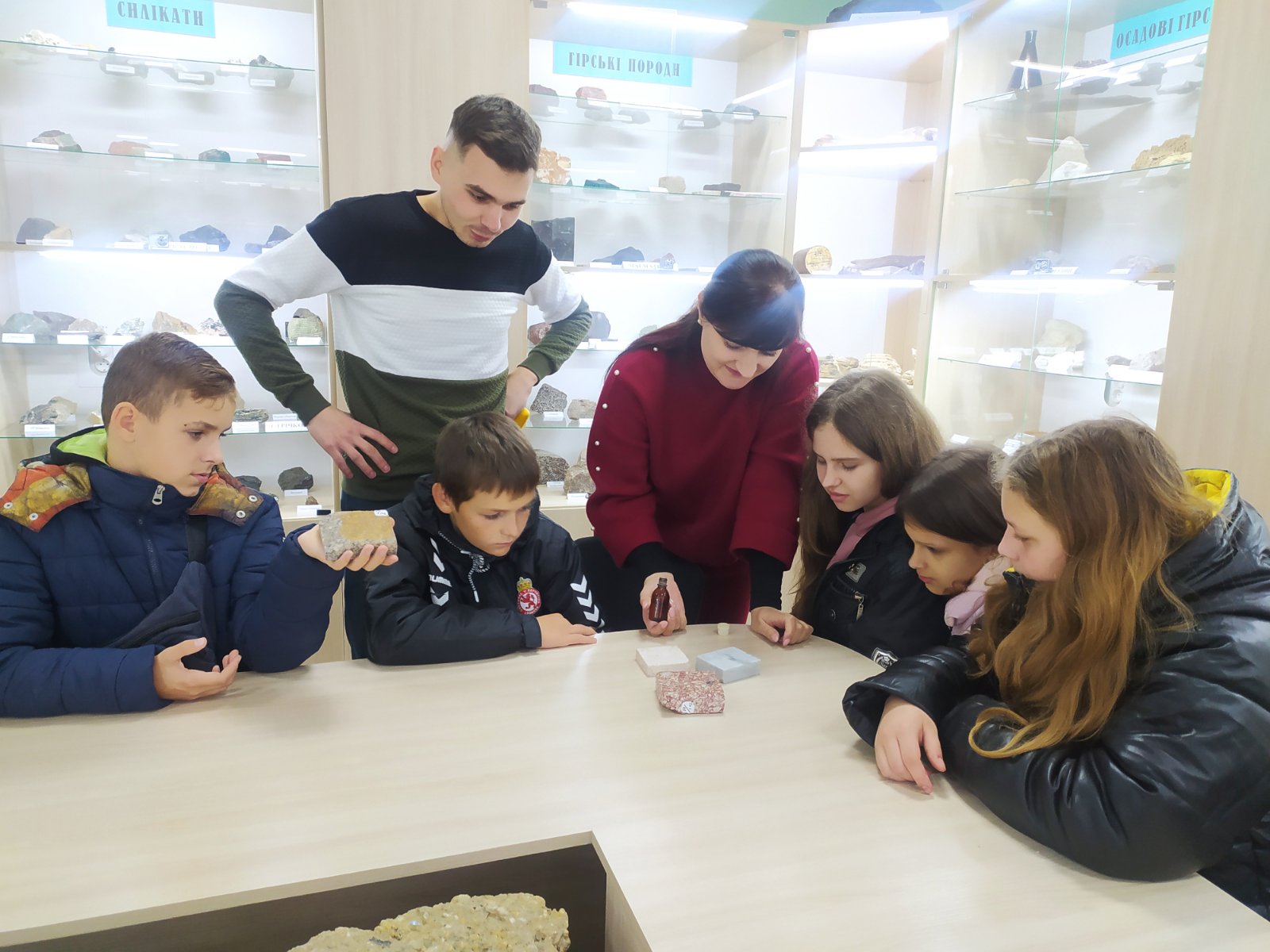 Завідувач музею канд. геогр. наук, доцент Данильченко О.С. та керівник геолого-краєзнавчого гуртка Мироненко А.О. провели спільно заняття на тему «Морфологія мінералів та їх класифікація». На занятті вихованці розглянули морфологію мінералів: друзи та щітки кварцу, секреції, конкреції фосфоритів, псевдоморфози по дереву, фрагменти сталактитів, дендрити. Учні познайомилися з основними представниками класів мінералів: графітом, сіркою, кальцитом, гіпсом, флюоритом, лімонітом, гематитом, магнетитом, кварцом, аметистом, гранатом і багатьма іншими, а також отримали завдання підготувати повідомлення про мінерал.