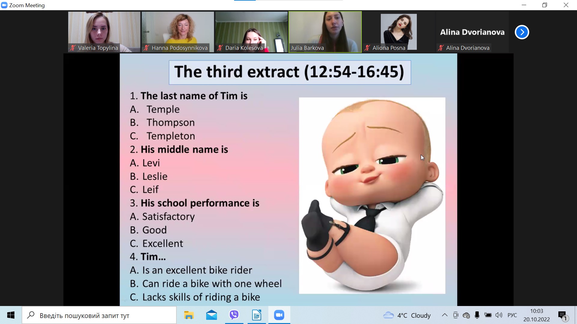 Цього разу майбутнім учителям англійської мови був запропонований кіноклуб, розроблений на матеріалі 3D анімаційного комедійного фільму «The Boss Baby» (2017 рік), знятий Томом Мак-Гратом за однойменною книгою Марли Фрейзі. У захоплюючому дивовижними та веселими пригодами мультфільмі піднімається важлива тема родинних цінностей, стосунків батьків та дітей, розподілу уваги та любові між декількома нащадками у сім'ї. Перегляд фрагментів автентичного анімаційного фільму, виконання завдань, обговорення та обмін враженням із подальшим аналізом кіноклубу в методичному аспекті допоміг студентам удосконали професійну методичну компетентність, розвинути емпатію та професійні психолого-педагогічні вміння, комплексно удосконалити мовленнєві навички та вміння за темами “Family”, “Appearance and Character”, “Feelings and Emotions”, а яскравий емоційний сюжет висвітлив гуманістичні цінності доброти, любові, духовної щирості та взаємної підтримки.
