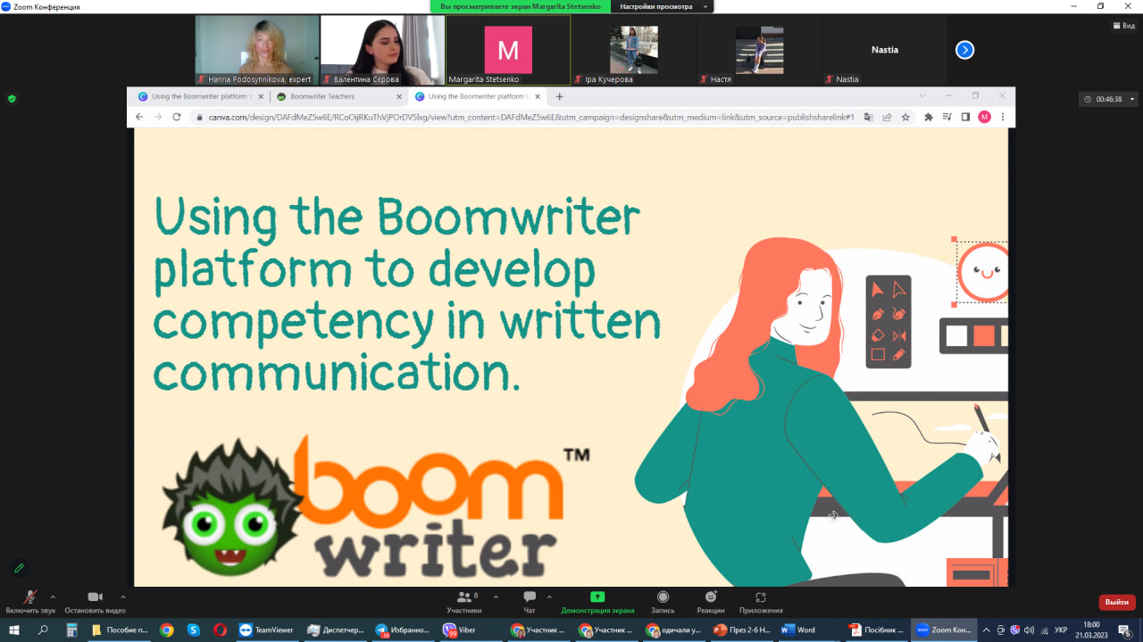 Маргарита Стеценко розповіла про використання платформи Boomwriter для формування англомовної компетентності у писемному мовленні базової школи. На прикладах показала, як цей застосунок виглядає для вчителя, як для учнів, і які завдання можна там створювати.