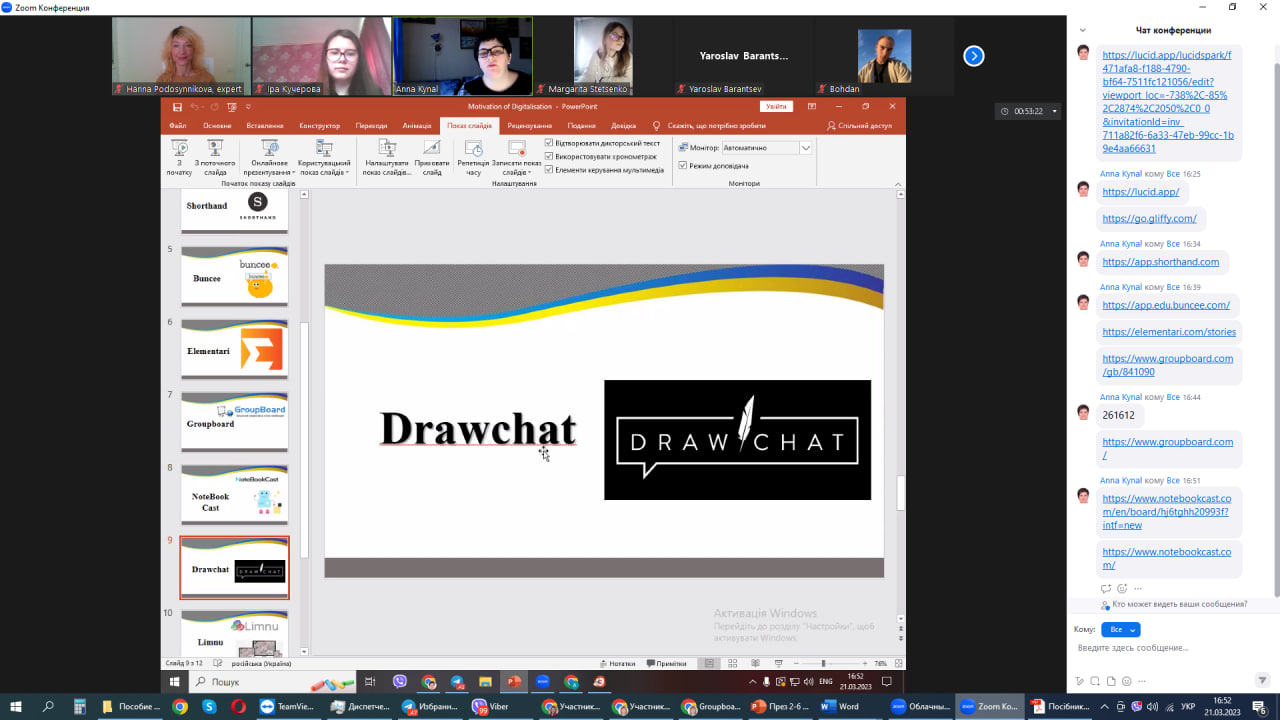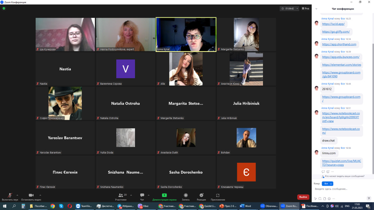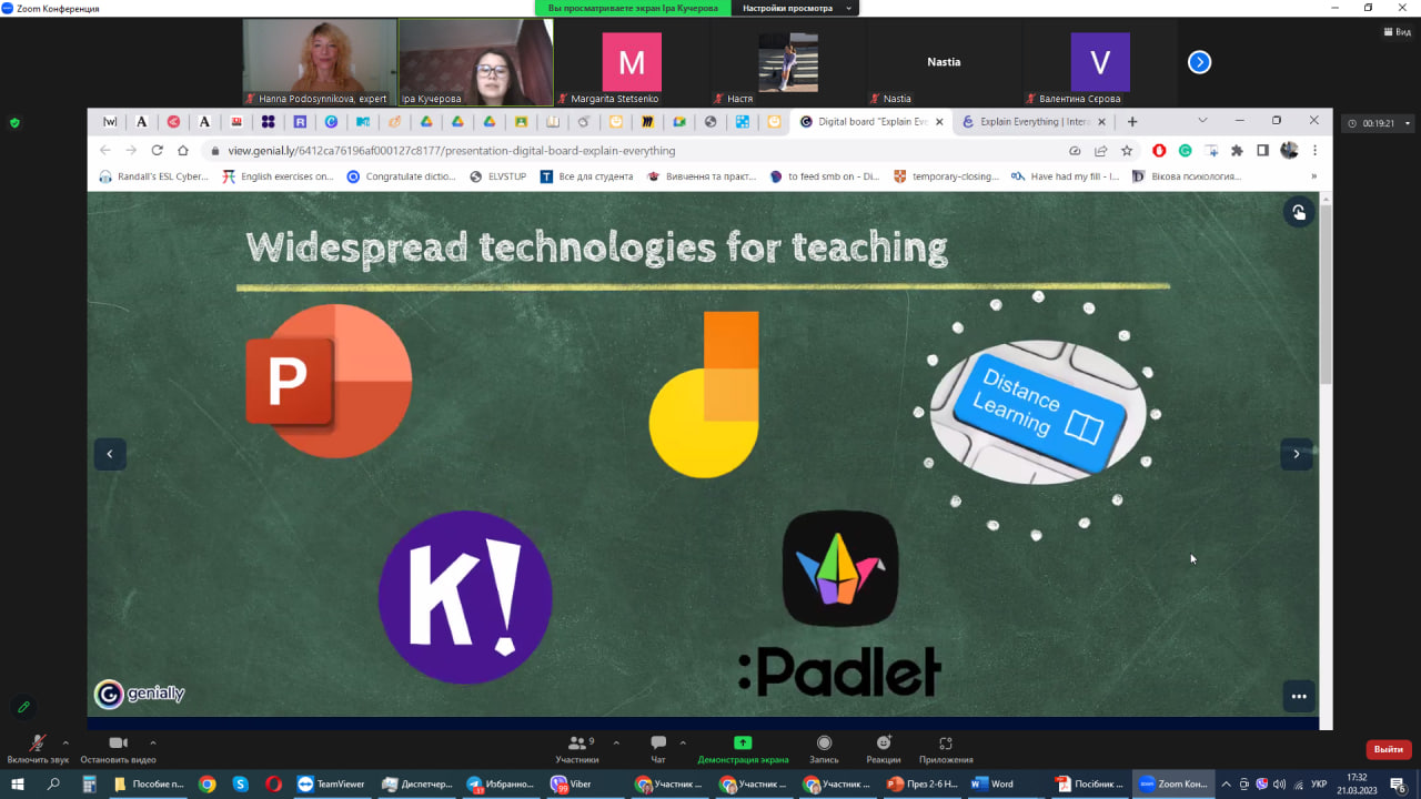 На зустріч зі студентами 3 і 4 курсу спеціальності 014 Середня освіта (Англійська мова) у межах виробничої педагогічної практики завітала запрошена спікерка КИНАЛЬ Анна Юріївна, к. пед. н., ст. викладачка кафедри англійської філології Вінницького державного педагогічного університету імені Михайла Коцюбинського, член лабораторії. Її виступ був надихаючим, яскравим і змістовним! Ми дізналися про різні шляхи і способи, як зробити свій урок набагато цікавішим і ефективнішим. Пані Анна он-лайн показала, як користуватися такими застосунками, як Lucidchar, Gliffy, Shorthand, Buncee, Elementari, Groupboard, NoteBook Cast, Drawchart, Limnu, і що в них можна створювати, поділилася цікавинками і нюансами використання деяких програм, про які ми не знали. Розказала про свої улюблені застосунки. Студенти повідомили, що більшістю із запропонованих платформ вони почнуть користуватися під час проведення своїх онлайн уроків.