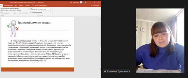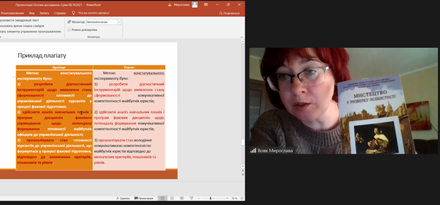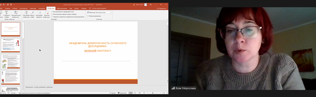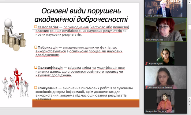 8 жовтня 2021 року студенти першого та другого курсу за ОПП Середня освіта (Українська мова і література. Англійська мова), Середня освіта (Українська мова і література) та магістрантка 6 курсу в межах виробничої (переддипломної) практики за фахом спеціальності 035 Філологія (Українська мова та література) Аліна Зленко відвідали бінарне заняття на тему «Академічна доброчесність сучасного дослідника: мовний контекст».
