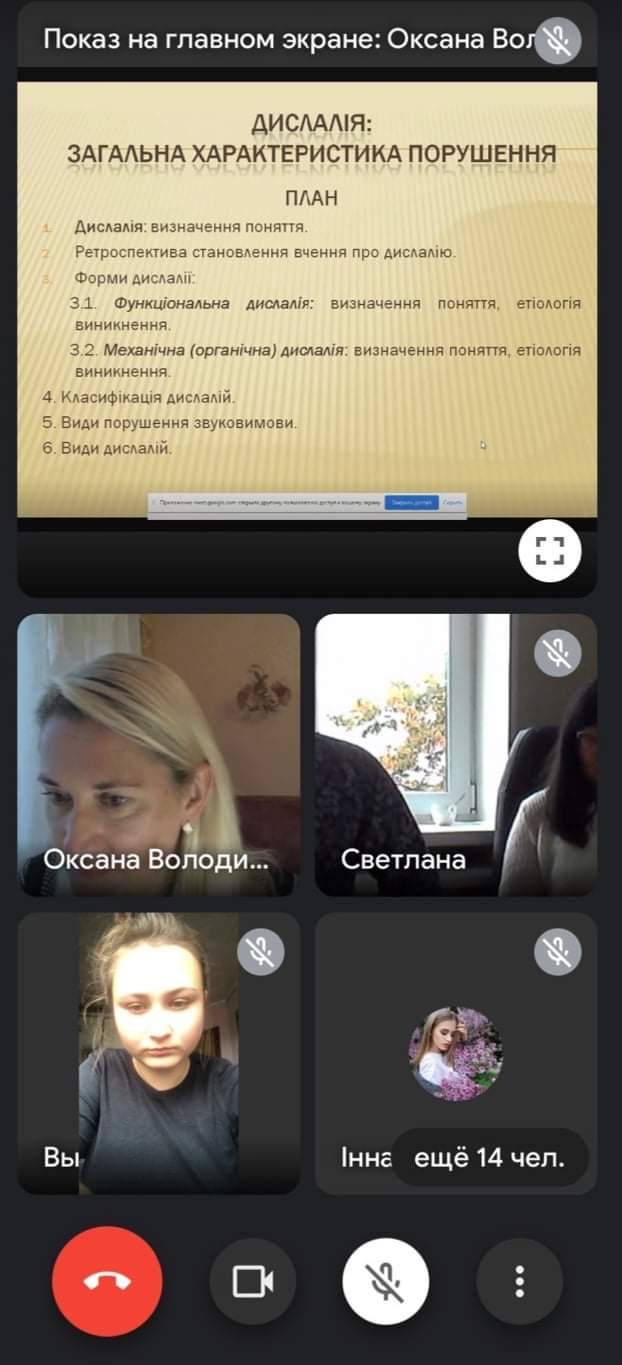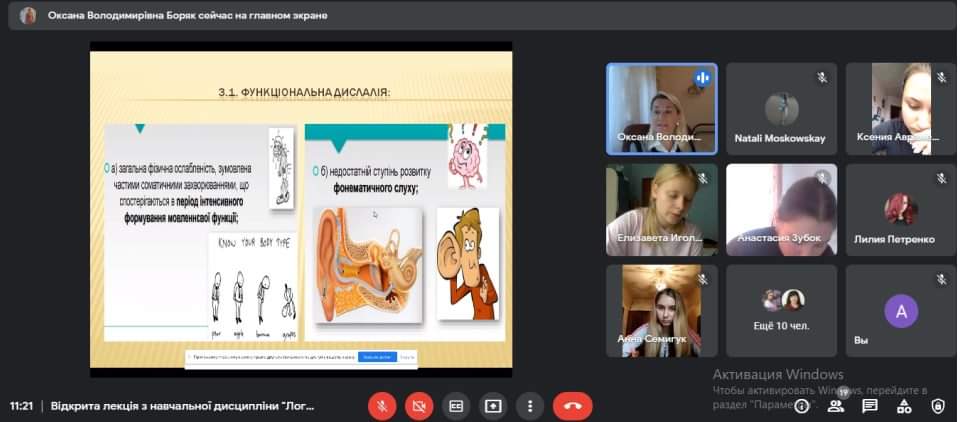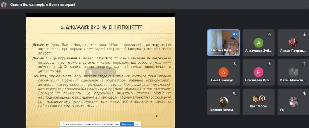 24 вересня 2021 року відбулася відкрита лекція професора кафедри спеціальної та інклюзивної освіти СумДПУ імені А.С. Макаренка Боряк Оксани Володимирівни зі студентами 0021 гр. на тему "Дислалія: загальна характеристика порушення".