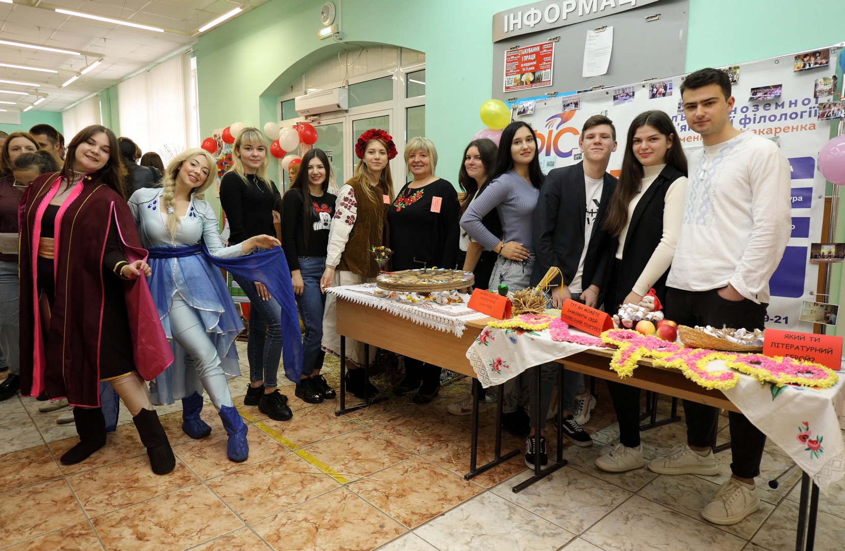 Тож гостей зустрічали "дівчина з легенди" Маруся Чурай (студдеканеса Софійка), козак Гриць (студент 3 курсу Назар) та Берегиня слов’ян Надія, які розкривали всі міфи про філологічний.