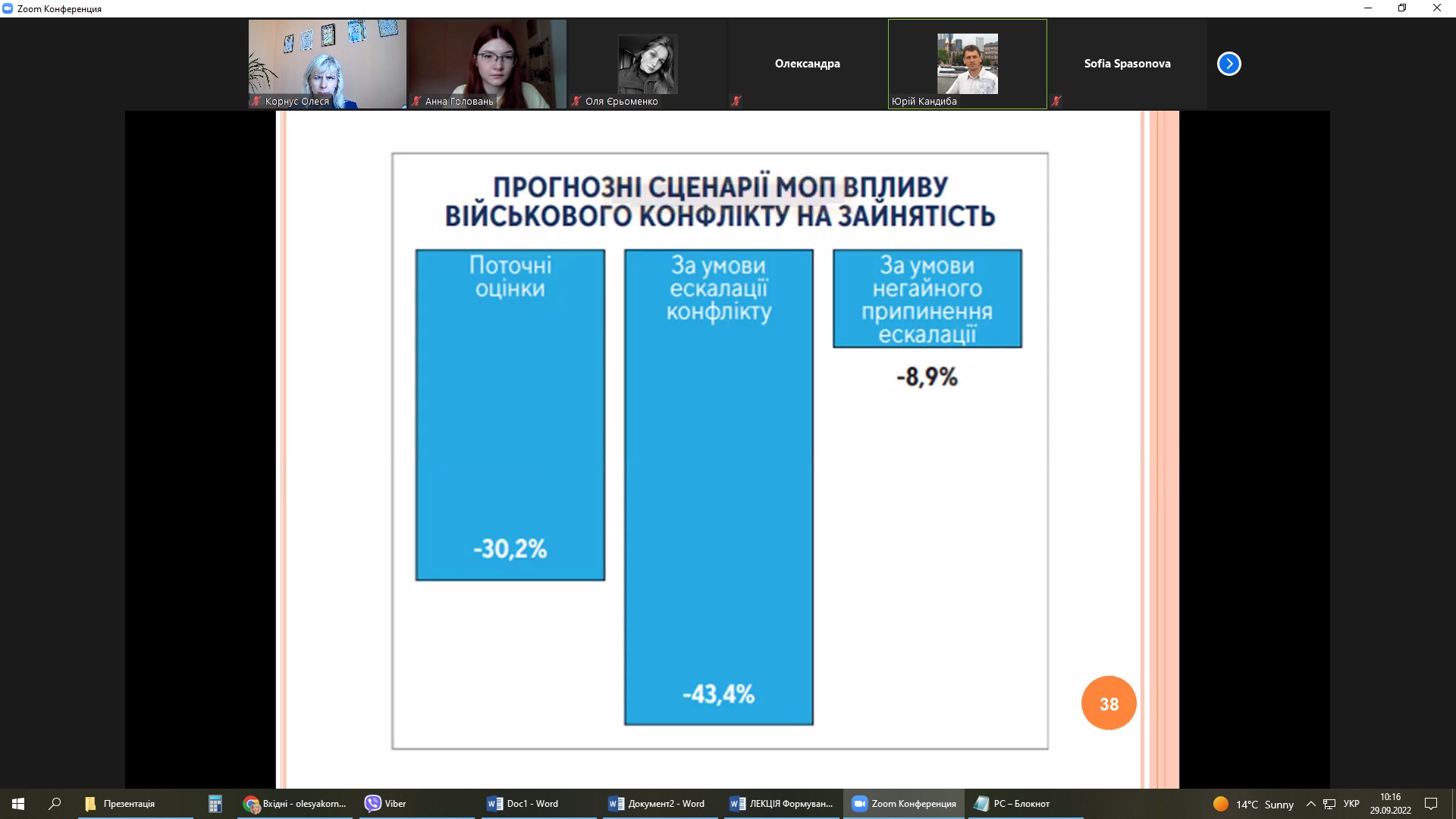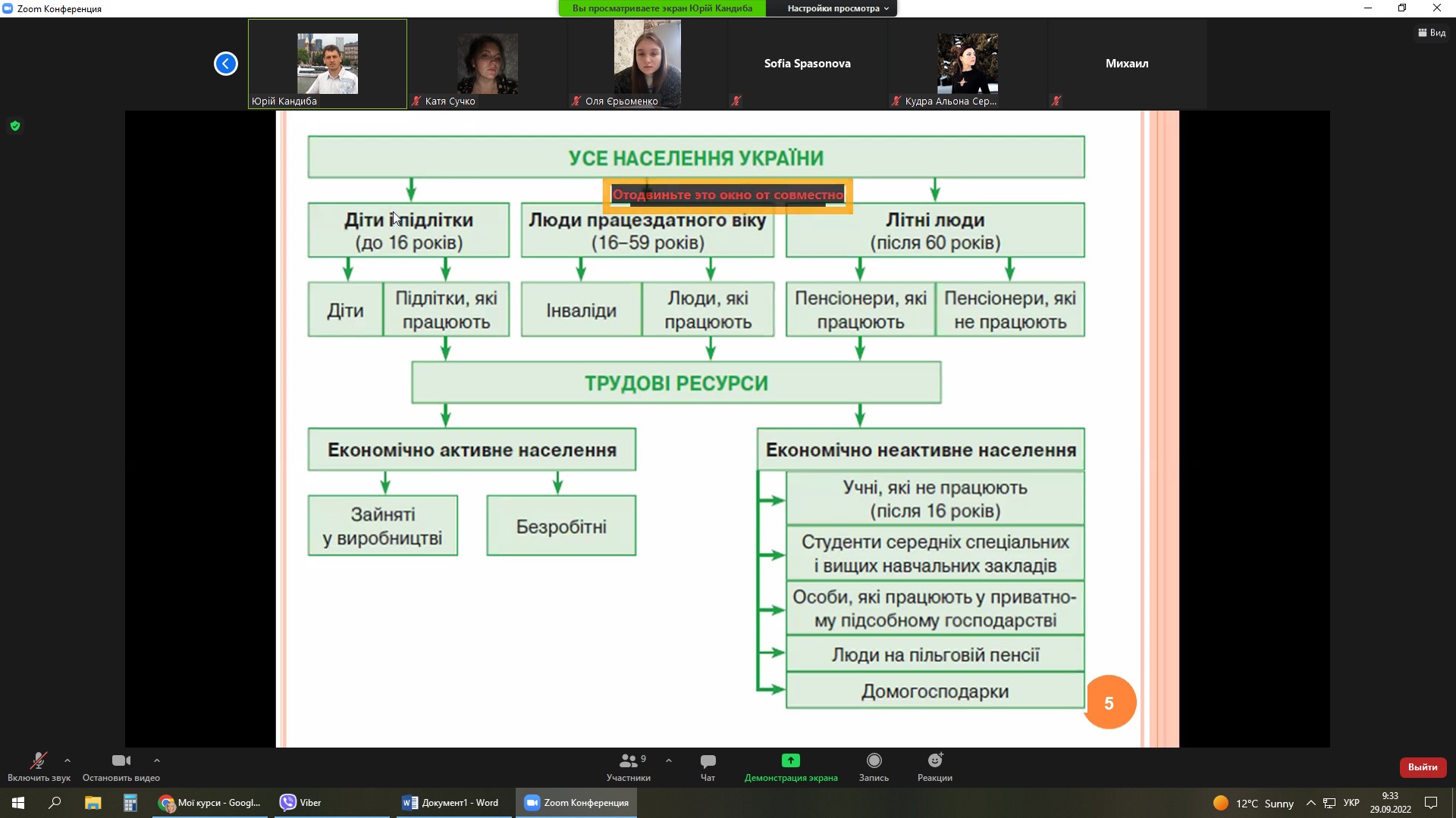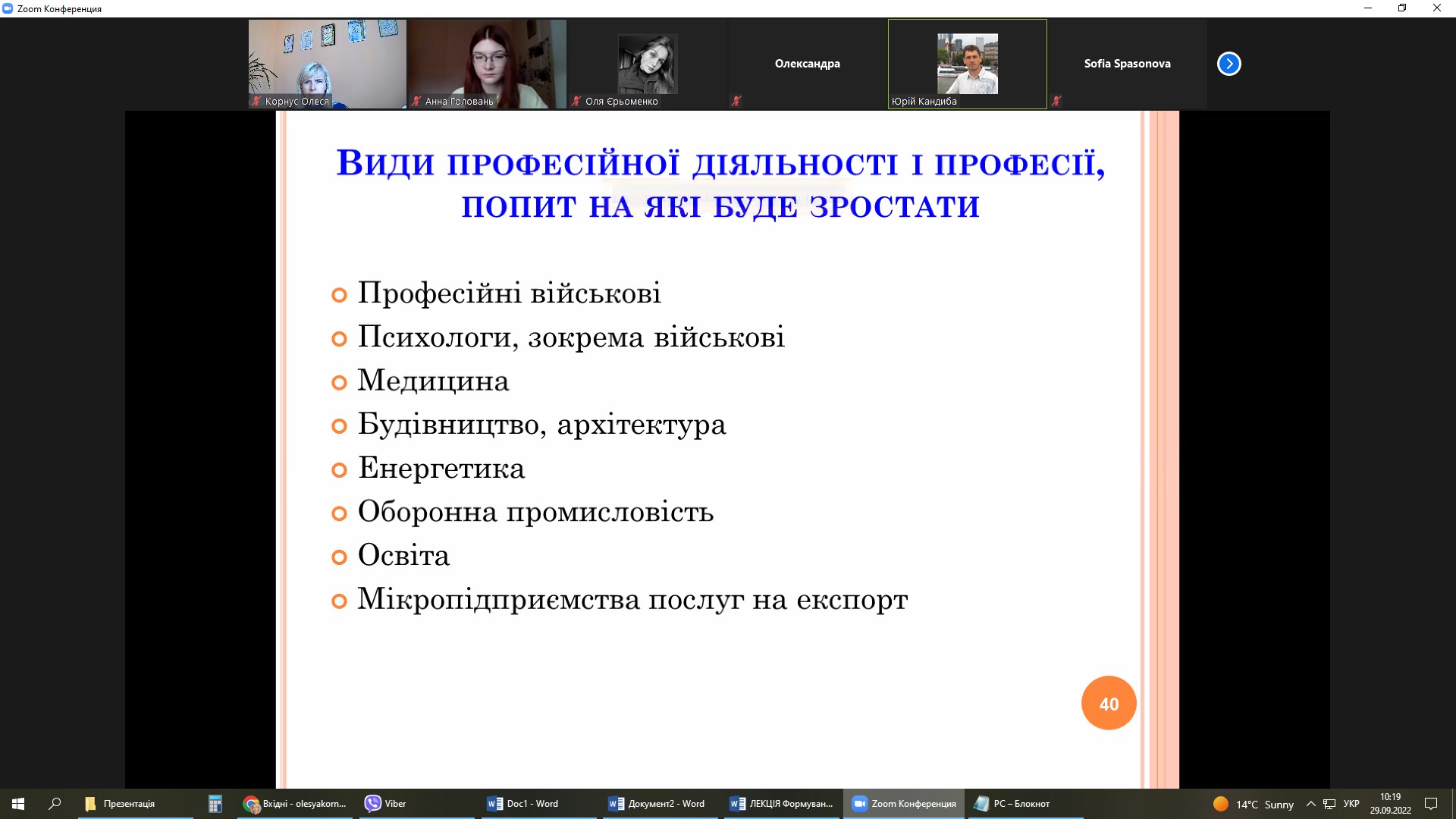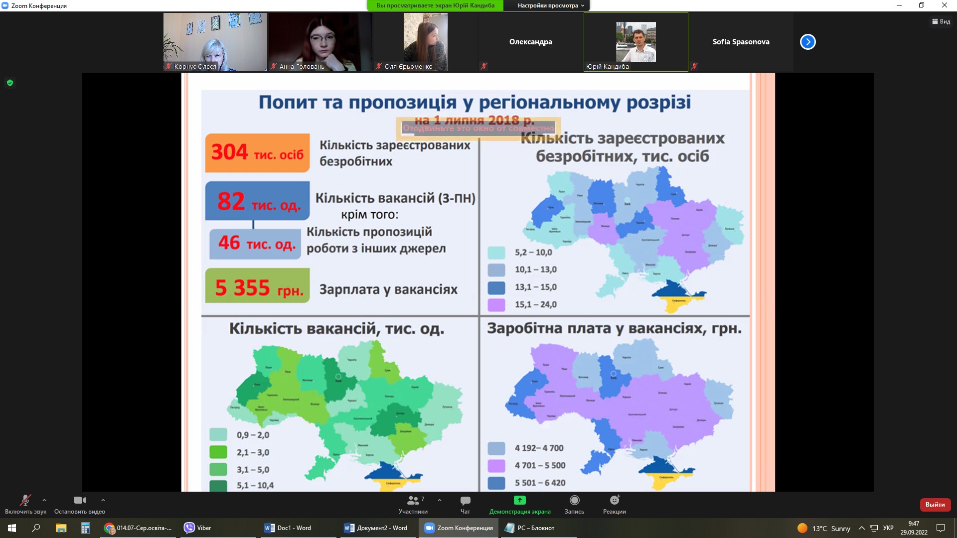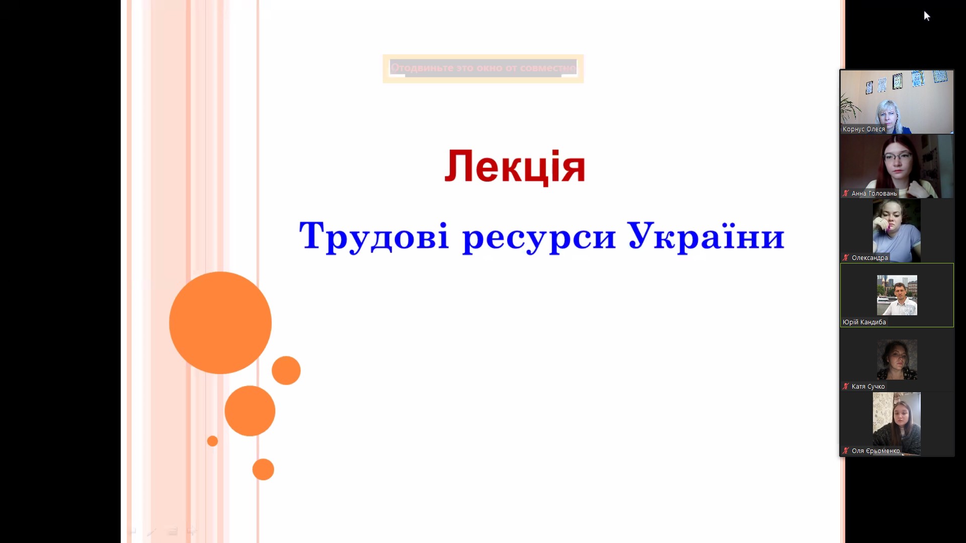 Лекція була присвячена трудовим ресурсам України. У ході лекції було розглянуто географічні аспекти трудових ресурсів та економічно активного населення України, особливості трудової міграції за останні роки. Разом з лектором студенти обговорили сучасний стан ринку праці в Україні, який склався в умовах пандемії Covid-2019 та війни з російською федерацією, прогнозні сценарії МОП впливу війни на зайнятість населення. Студенти брали активну участь в інтерактивному обговоренні лекційного матеріалу, а наприкінці заняття висловили щирі слова вдячності Ю.І. Кандибі за цікаву та змістовну лекцію.