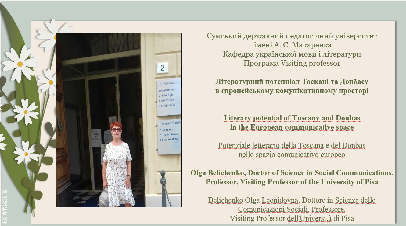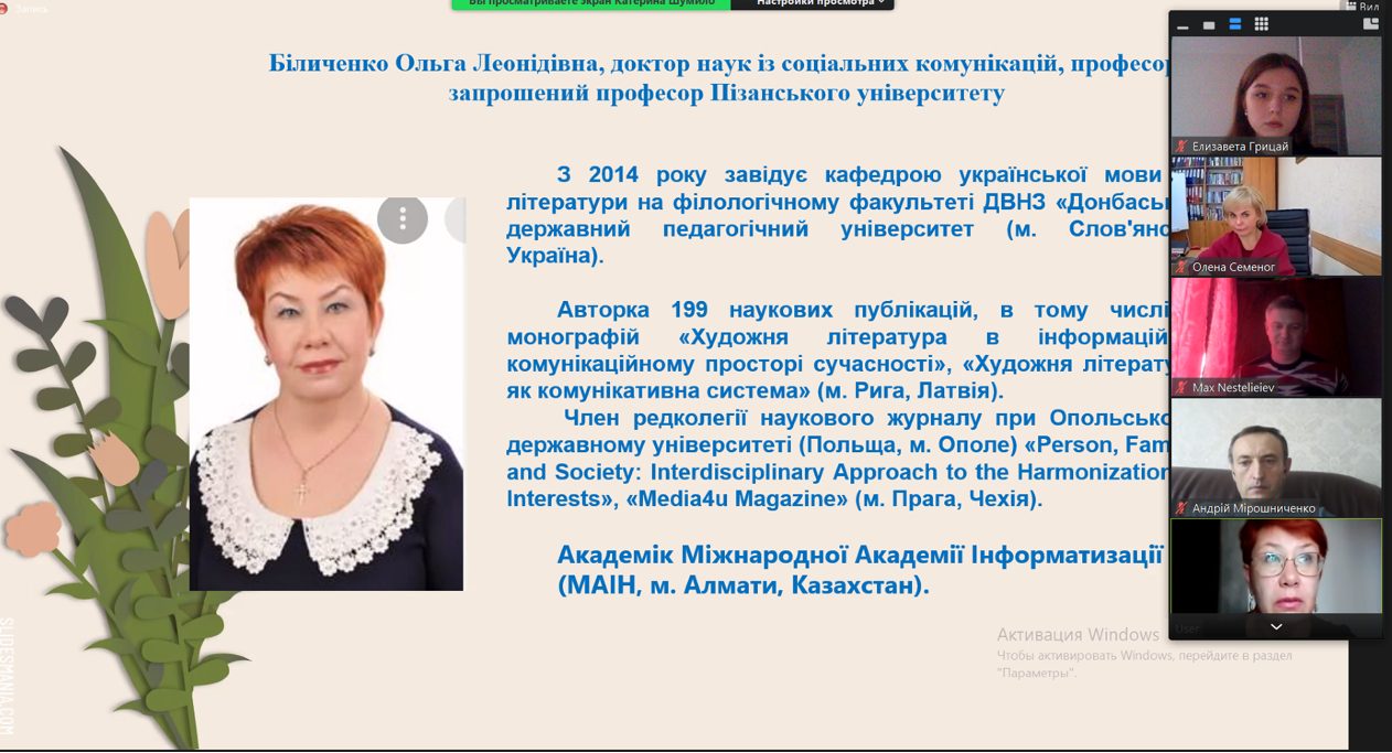 Узяли участь студенти 241 групи спеціальності 014 Середня освіта (Українська мова і література), учасники гуртка «Академічна культура дослідника», доцент Герман В.В. та запрошена лекторка Біличенко Ольга Леонідівна, професор, доктор наук із соціальних комунікацій, запрошена професорка кафедри філології, літератури та лінгвістики Пізанського університету (Італія). Модерувала заняття проф. Семеног О.М.