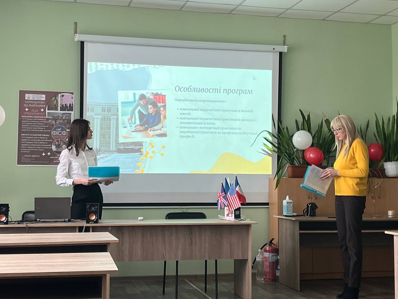 Після загальних урочистостей, студенти нашого факультету запропонували презентацію про їхнє бачення академічного життя та розповіли в яскравих деталях про навчання за спеціальностями 014 Середня освіта (Мова і література) (англійська, німецька, французька). Абітурієнти та їхні батьки мали змогу поставити запитання декану факультету Коваленку А.М., завідувачу кафедри англійської філології та лінгводидактики Подосинніковій Г.І., викладачам кафедри, а також самим студентам.