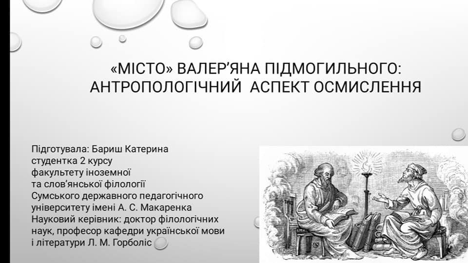 Виступи студентів теж були цікавими. К.Бариш, студентка 2 курсу мала можливість представити тему доповіді «Місто» В. Підмогильного: антропологічний аспект осмислення (наук. керівник – Горболіс Л.М., доктор філологічних наук, професор).