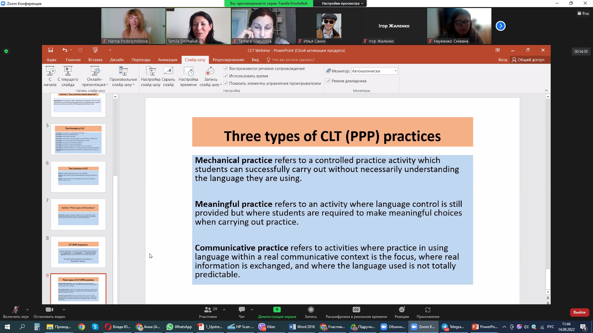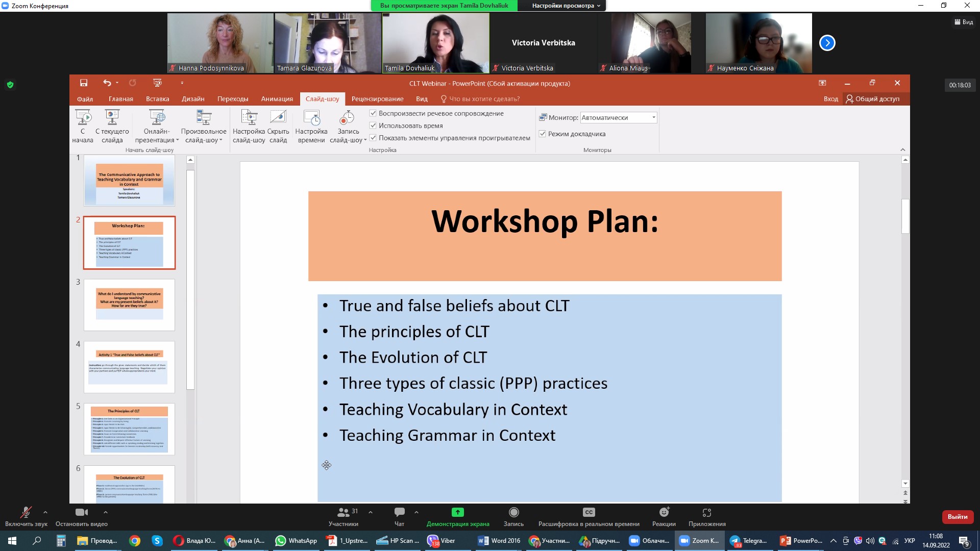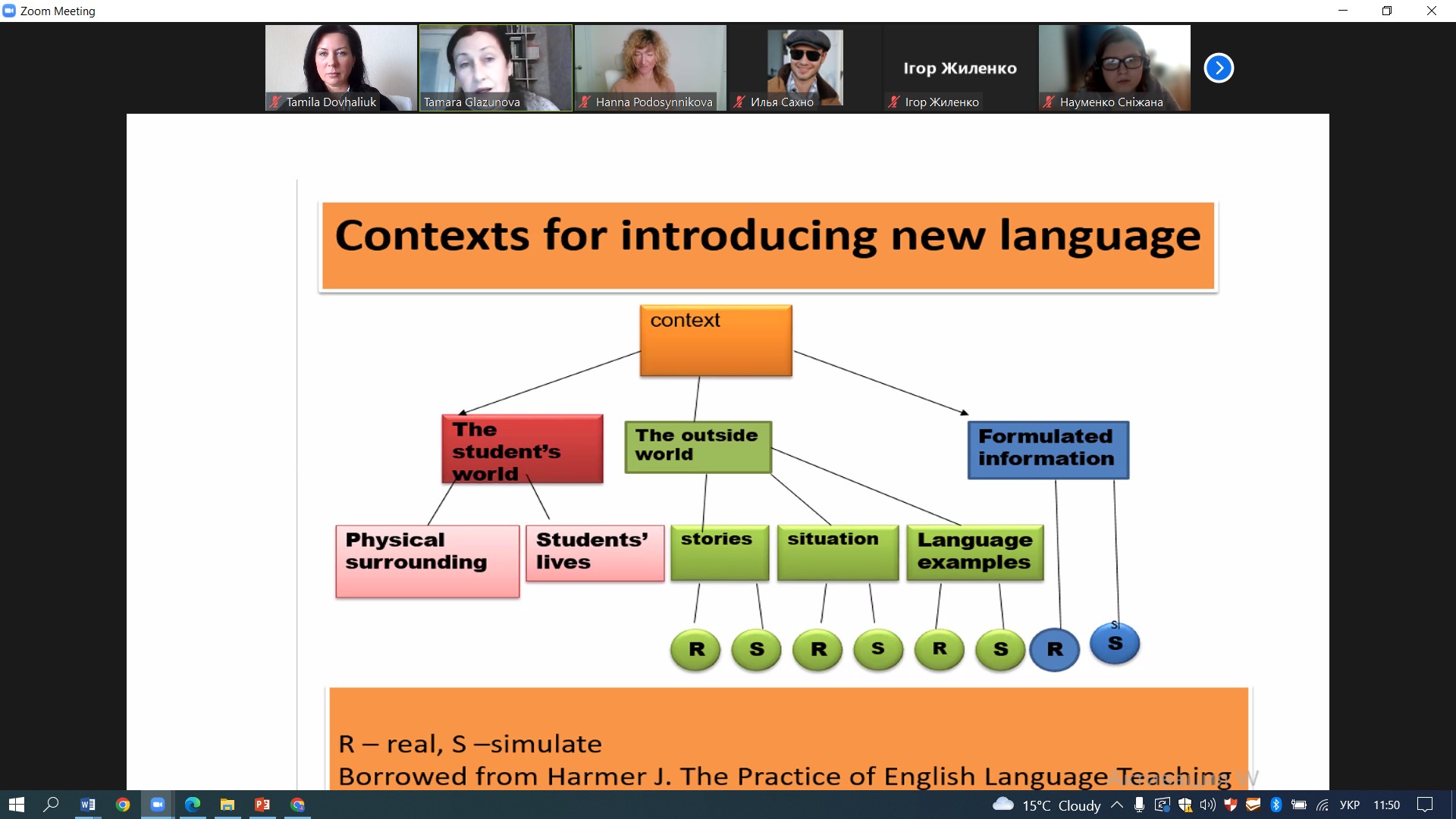 Захід було проведено он-лайн англійською мовою у форматі воркшопу у межах курсу «Інноваційні технології навчання іноземних мов і культур» (викладач – к.пед.н., доцент Г.І.Подосинікова): пригадали та обговорили в сесійних залах (break-out rooms) основи сучасної комунікативної методики навчання іноземних мов і культур, приклади їх практичної реалізації; розглянули технології комунікативно-орієнтованого навчання лексики та граматики англійської мови, пограли в ігри, потренували пам’ять і увагу.