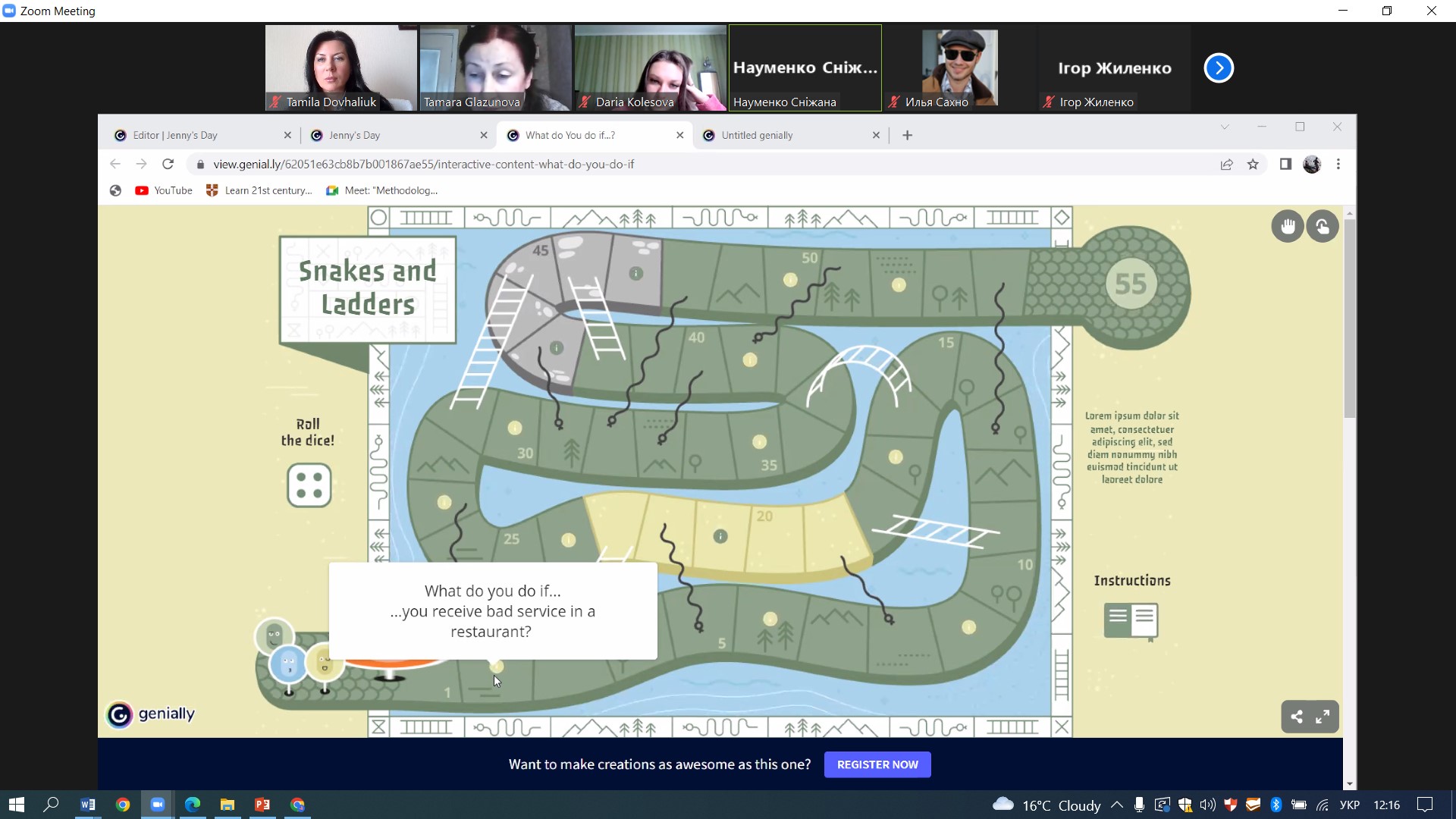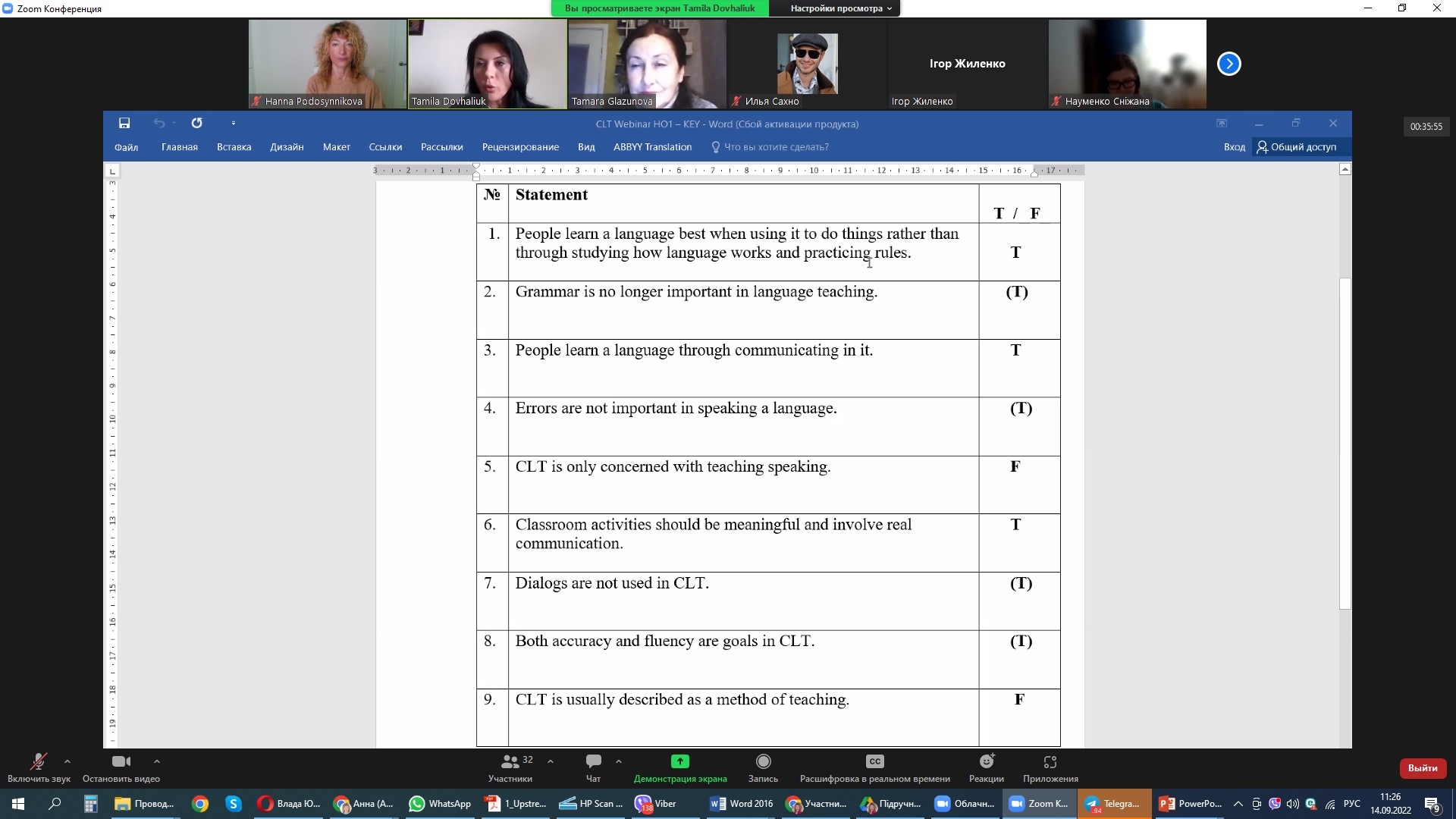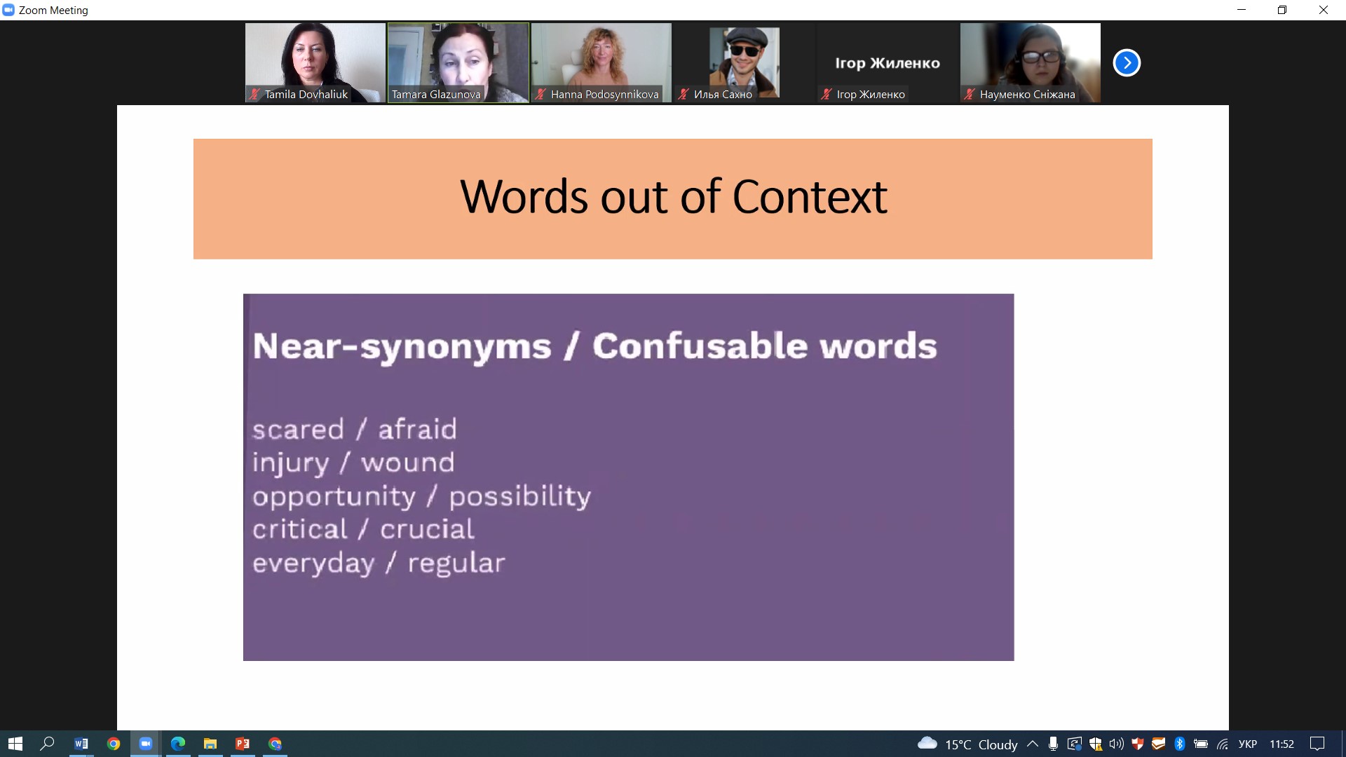 Захід було проведено он-лайн англійською мовою у форматі воркшопу у межах курсу «Інноваційні технології навчання іноземних мов і культур» (викладач – к.пед.н., доцент Г.І.Подосинікова): пригадали та обговорили в сесійних залах (break-out rooms) основи сучасної комунікативної методики навчання іноземних мов і культур, приклади їх практичної реалізації; розглянули технології комунікативно-орієнтованого навчання лексики та граматики англійської мови, пограли в ігри, потренували пам’ять і увагу.