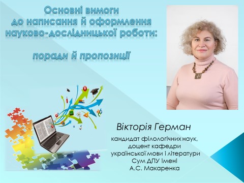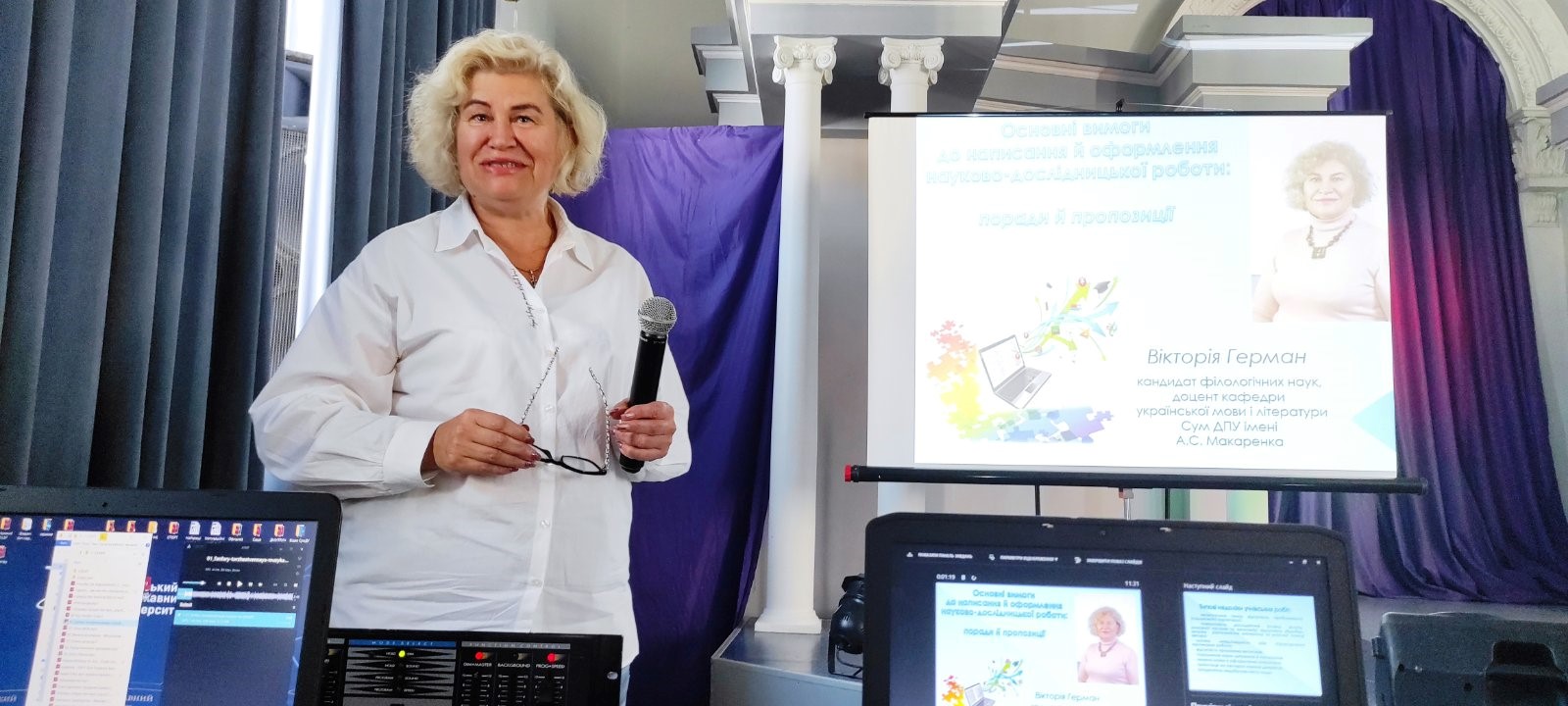 Доцент кафедри української мови Сумського державного педагогічного університету імені А. С. Макаренка Вікторія Герман узяла активну участь в її роботі: прочитала онлайн лекцію «Основні вимоги до написання й оформлення науково-дослідницької роботи» для вчителів-керівників, стейкхолдерів із різних громад Сумської області; надала поради учням щодо мовного оформлення робіт, провела індивідуальні консультації з молодими науковцями, допомогла обрати теми, продемонструвала зразки тощо.