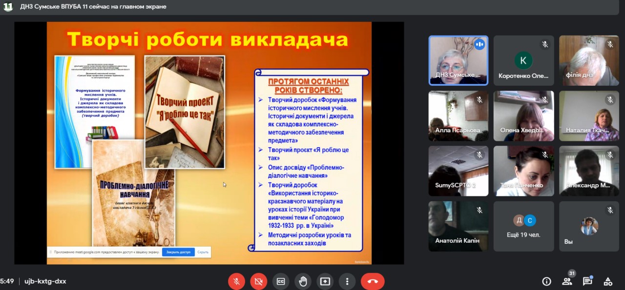 Досвід роботи щодо викладання історії, громадянської освіти застосування сучасних освітніх технологій на уроках в офлайн та онлайн навчанні також презентували Любов УСІКОВА, Надія СИДЕЛЬНИК (Сумське вище професійне училище будівництва та автотранспорту); Тетяна ДУДНИК (Лебединське вище професійне училище лісового господарства); Алла ОДЕСЬКА (Сумський центр ПТО харчових технологій, торгівлі та ресторанного сервісу).
