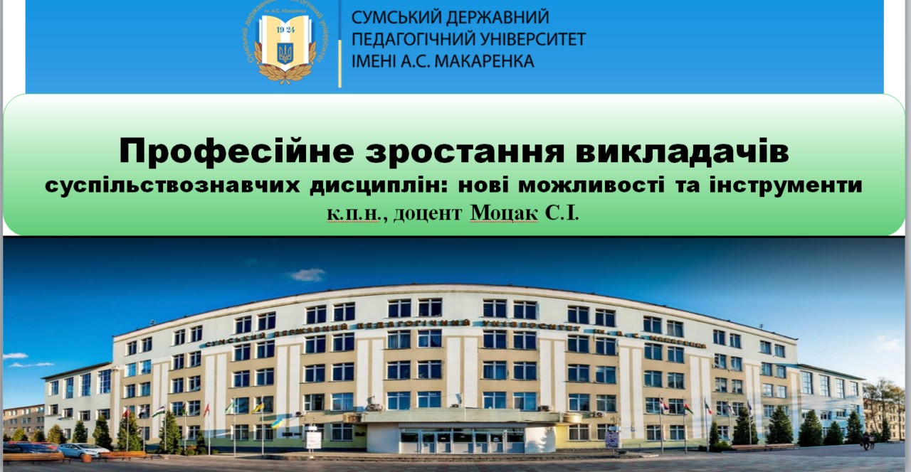 23 вересня 2021 р. завідувач кафедри всесвітньої історії, міжнародних відносин та методики навчання історичних дисциплін СумДПУ ім. А.С. Макаренка кандидат педагогічних наук, доцент С.І. Моцак долучилася до роботи триденного методичного дайджесту для викладачів суспільствознавчих дисциплін закладів професійної (професійно-технічної) освіти, метою якого стало обговорення актуальних питань організації освітнього процесу та планування роботи в умовах змішаного (дистанційного) навчання у 2021/2022 навчальному році.