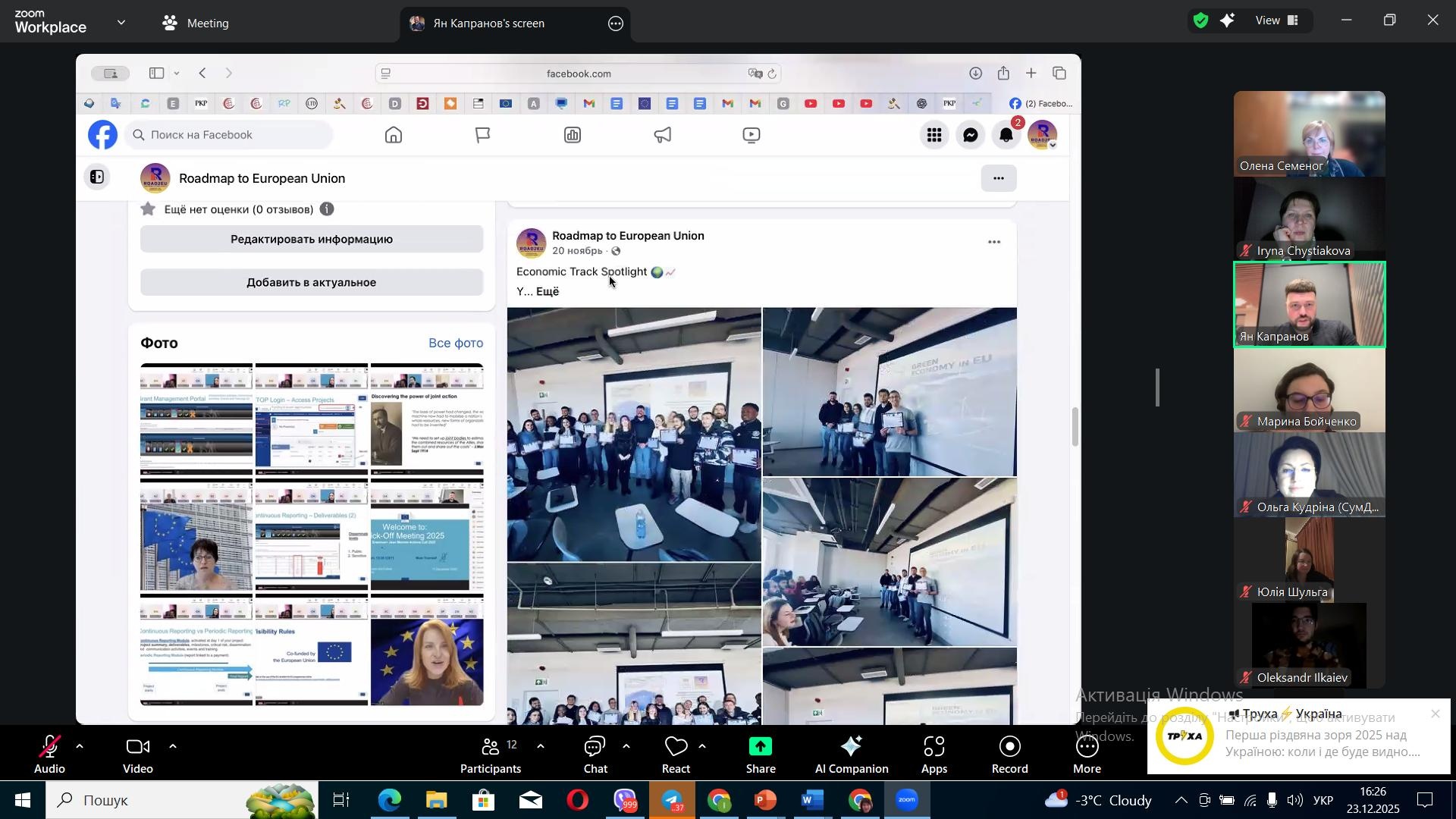 23 грудня 2025 року відбувся підсумковий круглий стіл (Making Europe Visible), присвячений рефлексії щодо спільного навчання. Основну доповідь представив д-р габ., проф. Ян КАПРАНОВ. Учасники заслухали відгуки зовнішніх експерток VISUAL-EU від СумДПУ: проректорки з наукової роботи, д. екон. н., проф. Ольги КУДРІНОЇ та д.пед.н., проф. Олени СЕМЕНОГ з конструктивним огляд активностей Зимової школи VISUAL-EU.