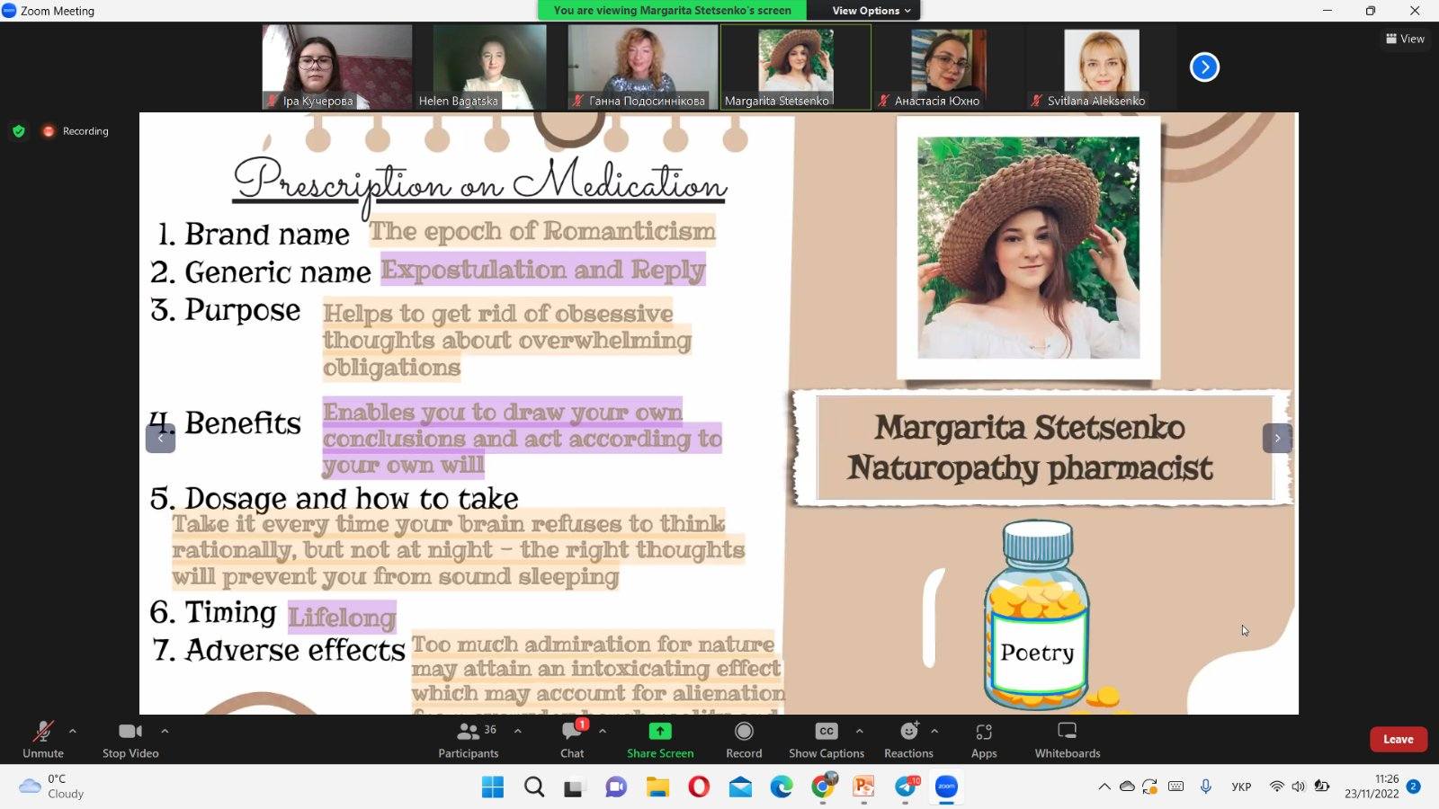 Майбутні вчителі англійської мови запропонували власні інтерпретації, у яких поетичні твори відомих британських авторів (William Wordsworth, William Henry Davis, Derek Wakott, Seamus Heaney, Ted Hughes) постали як дієві ліки від найактуальніших психологічних хвороб сьогодення: почуттів самотності, некотрольованості власного життя, нерозділеного кохання, нестачі творчого натхнення, тощо.