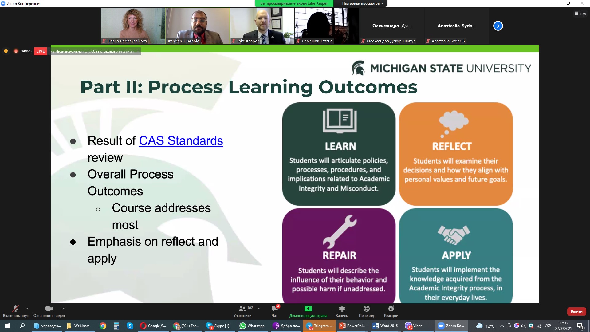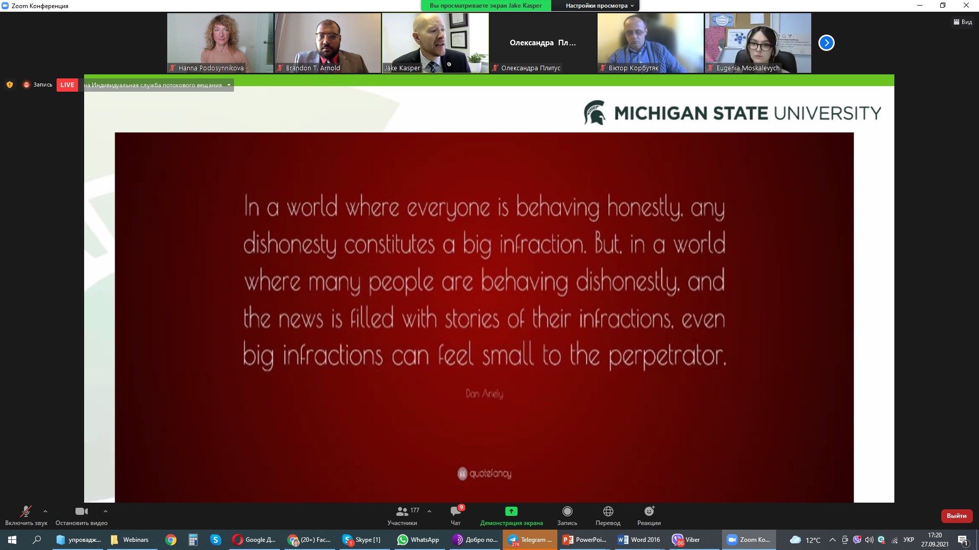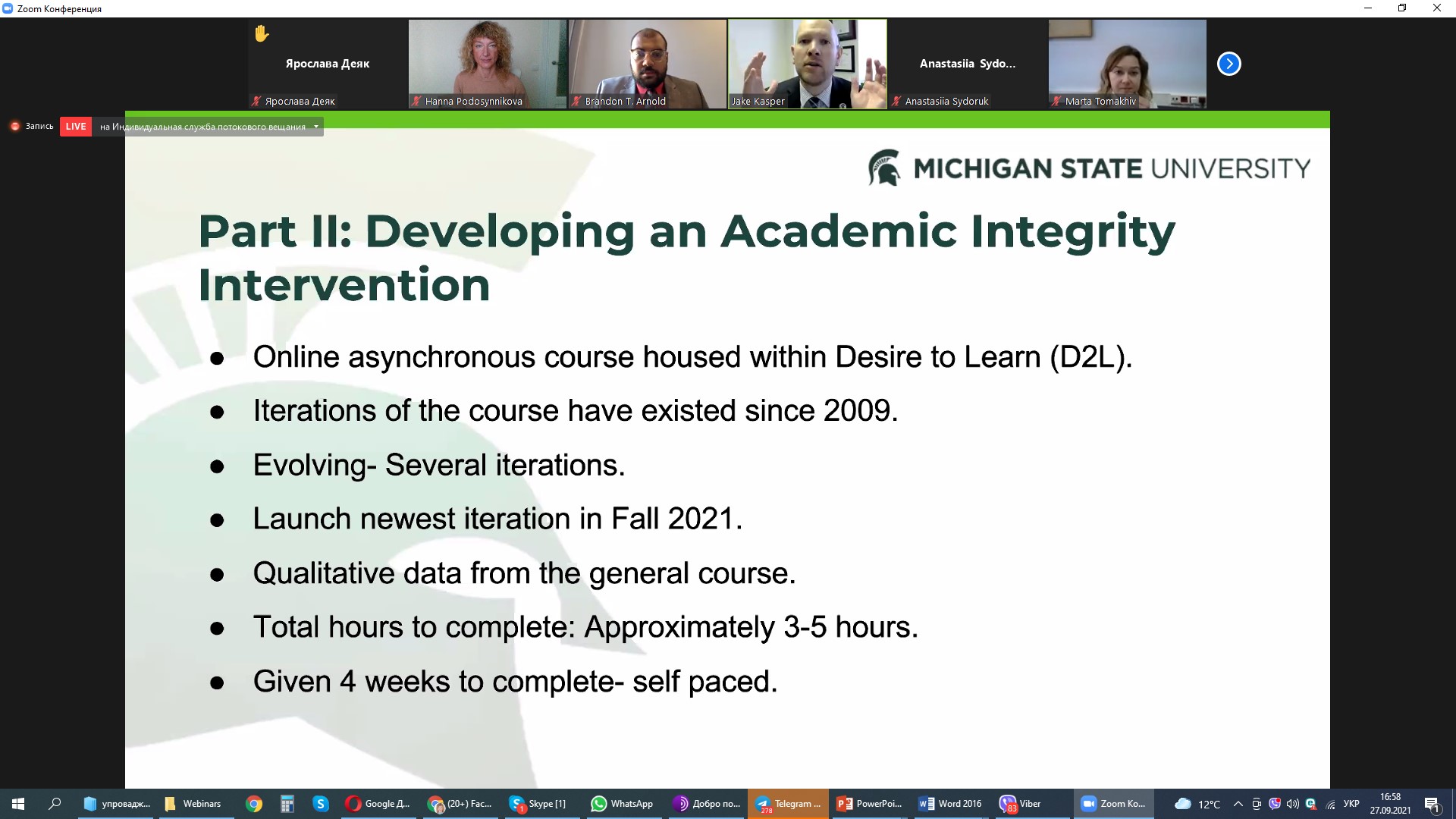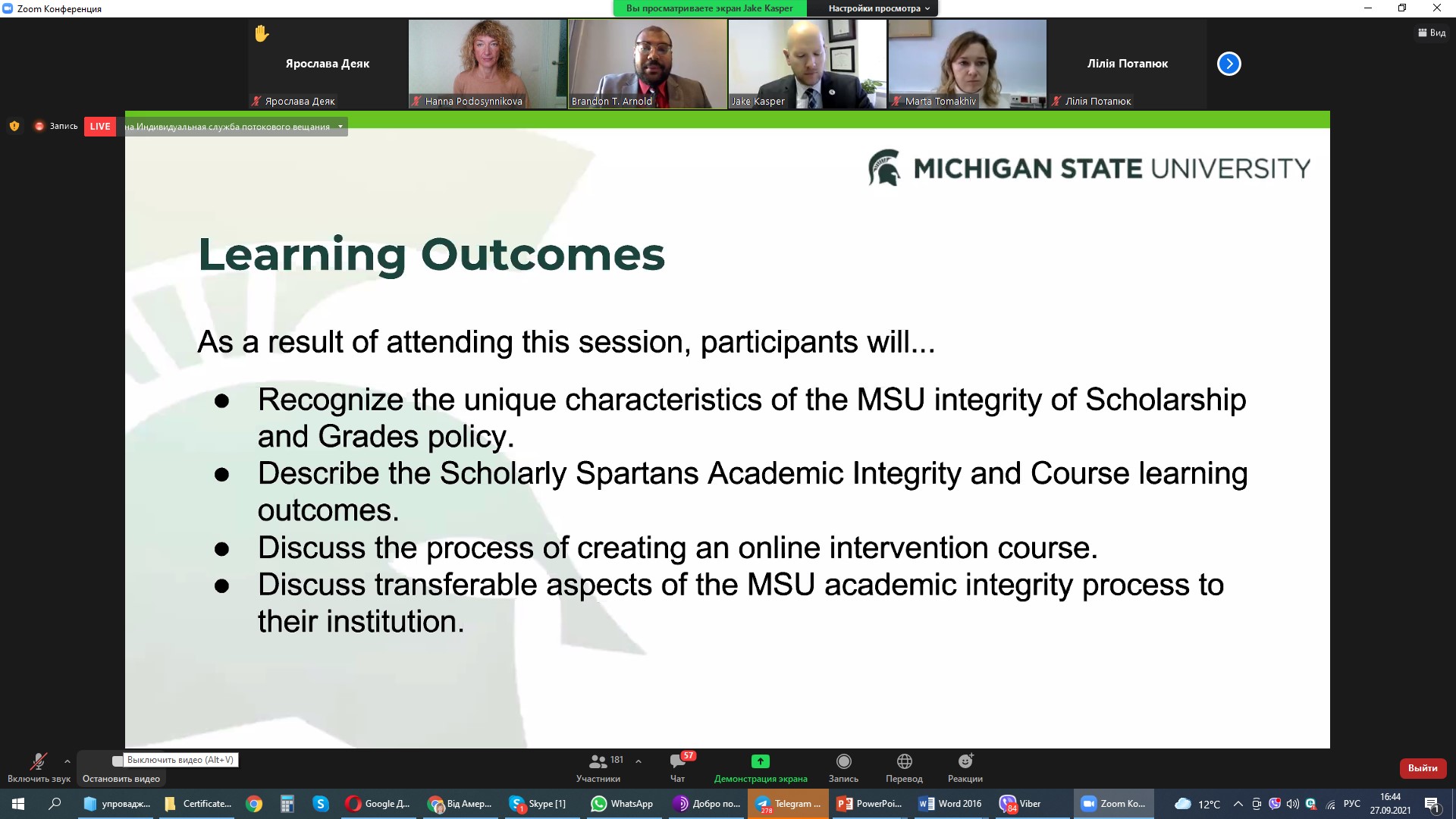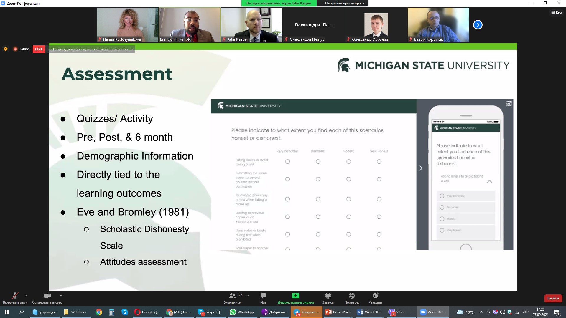 Спікери вебінару, Джейк Каспер (фахівець із питань академічної доброчесності у Деканаті по роботі зі студентами Університету штату Мічиган) та Брендон Арнолд (координатор програм по роботі із новими студентами в Офісі програм для нових студентів та сімей Темпльського університету) презентували цікавий досвід Університету штату Мічиган (Michigan State University) та Темпльського університету (Temple Univerisity) у створенні унікальних моделей системи академічної доброчесності та оцінювання . Учасники вебінару дізналися про те, як окремі елементи цих систем можуть бути втілені на кампусі інших університетів, розглянули питання практичного створення курсів з академічної доброчесності для студентів. Фахівці проєкту поділилися досвідом що до того, які аспекти найкраще включати у зміст таких курсів, обговорили модульну структуру курсу, ефективні типи завдань (case study), приклади організації рефлексії та інструментів оцінювання. Було наголошено на необхідності розуміння того, що мотивації студентів до порушення вимог академічної доброчесності є здебільшого комплексними та неусвідомленими, а також на важливості формування вмінь навчально-стратегічної компетентності (time management, learning strategies, etc.).
