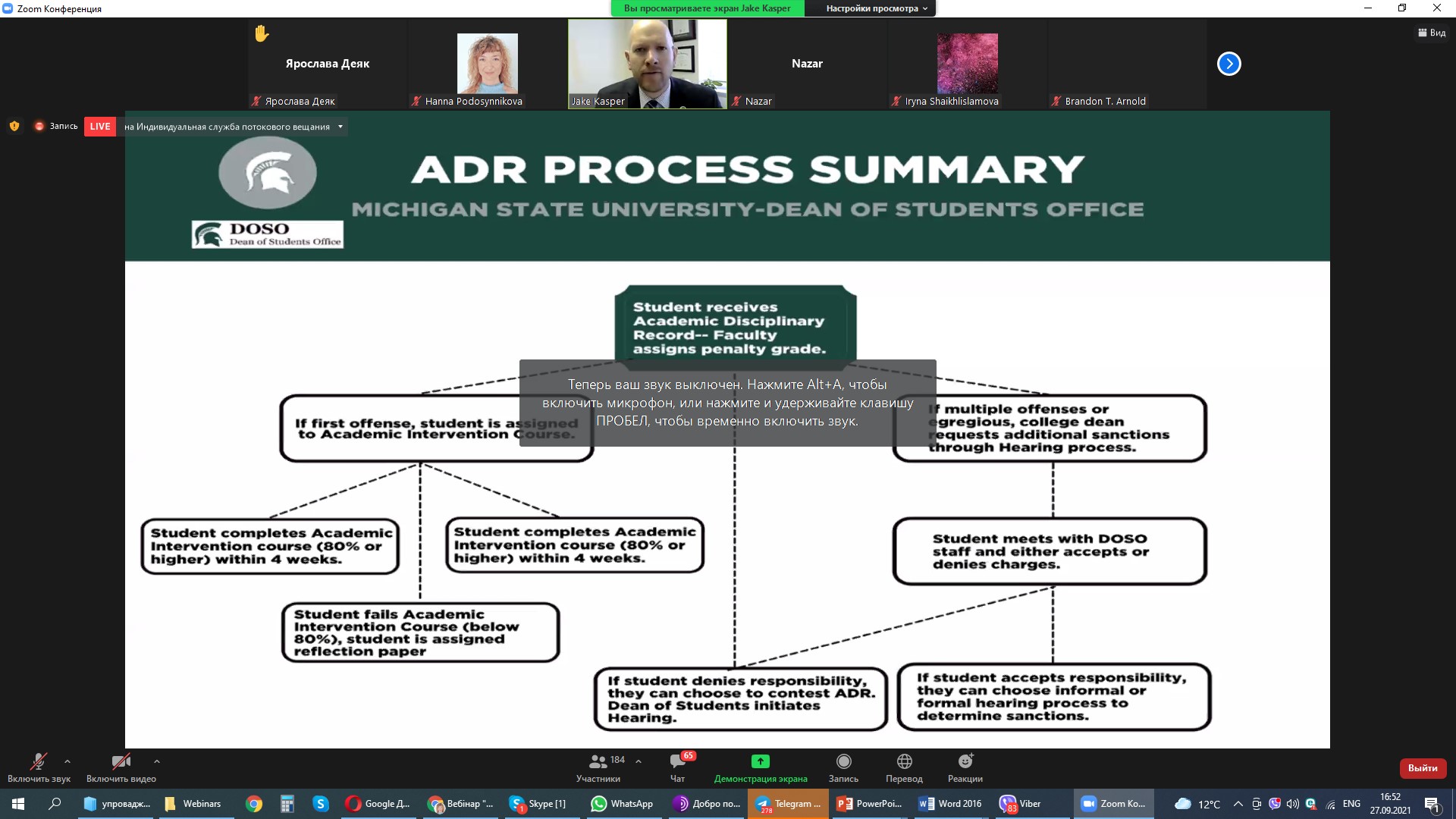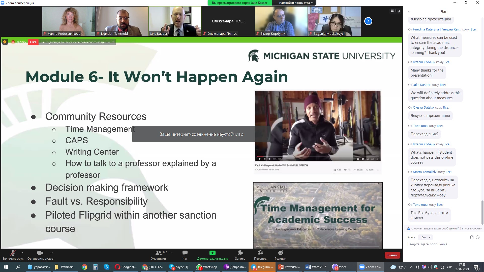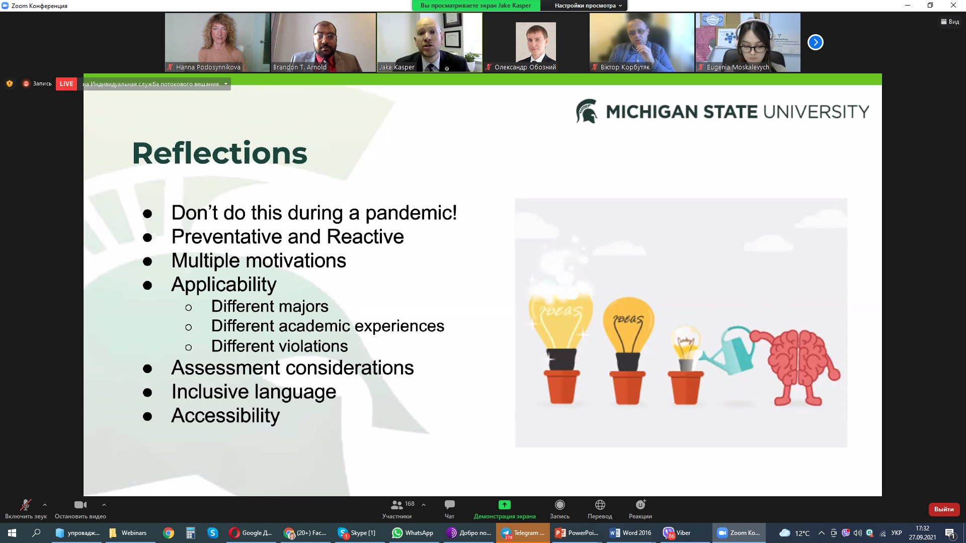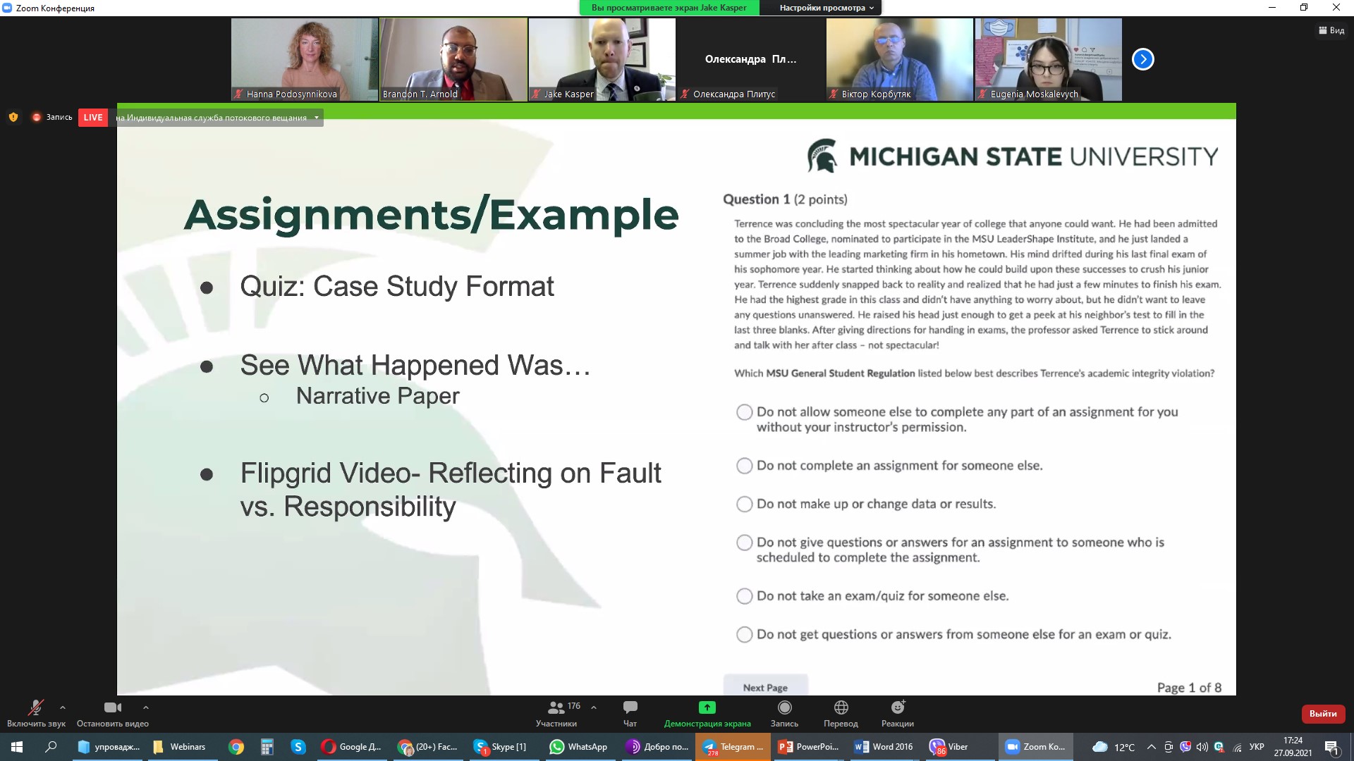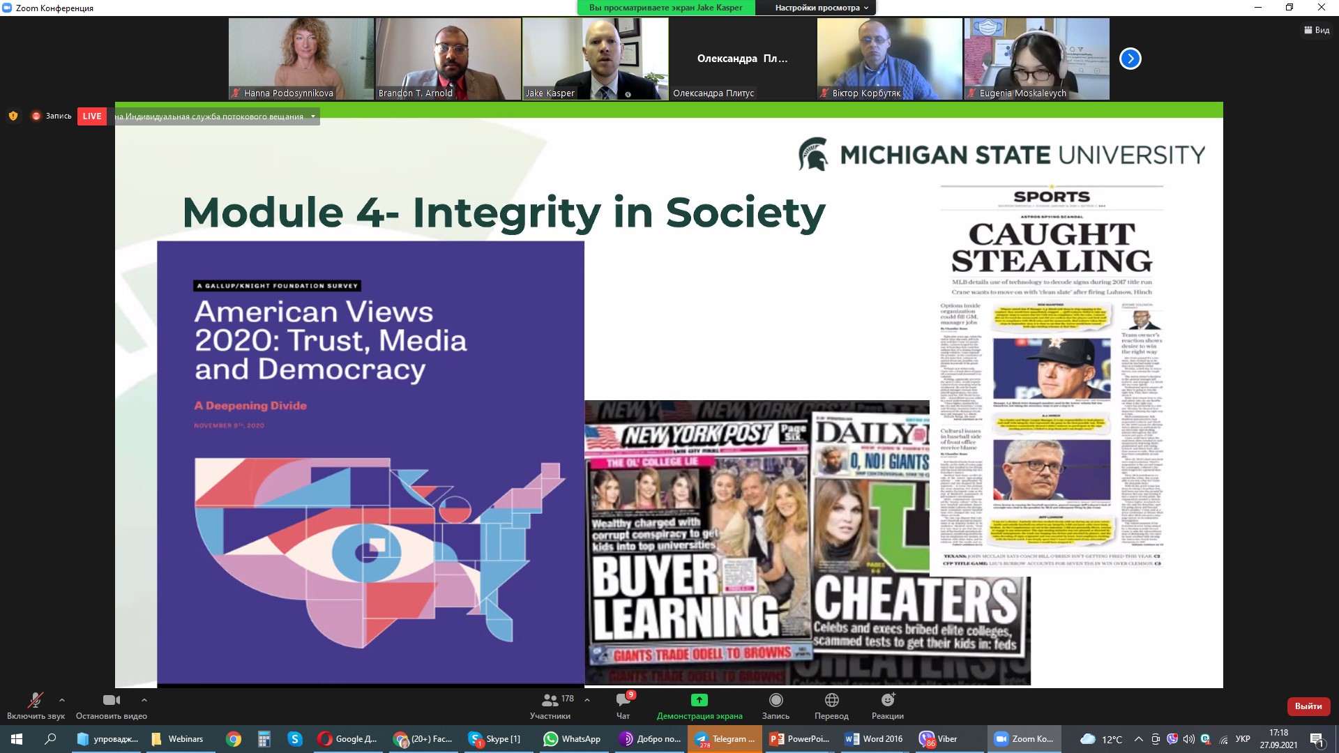 Спікери вебінару, Джейк Каспер (фахівець із питань академічної доброчесності у Деканаті по роботі зі студентами Університету штату Мічиган) та Брендон Арнолд (координатор програм по роботі із новими студентами в Офісі програм для нових студентів та сімей Темпльського університету) презентували цікавий досвід Університету штату Мічиган (Michigan State University) та Темпльського університету (Temple Univerisity) у створенні унікальних моделей системи академічної доброчесності та оцінювання . Учасники вебінару дізналися про те, як окремі елементи цих систем можуть бути втілені на кампусі інших університетів, розглянули питання практичного створення курсів з академічної доброчесності для студентів. Фахівці проєкту поділилися досвідом що до того, які аспекти найкраще включати у зміст таких курсів, обговорили модульну структуру курсу, ефективні типи завдань (case study), приклади організації рефлексії та інструментів оцінювання. Було наголошено на необхідності розуміння того, що мотивації студентів до порушення вимог академічної доброчесності є здебільшого комплексними та неусвідомленими, а також на важливості формування вмінь навчально-стратегічної компетентності (time management, learning strategies, etc.).