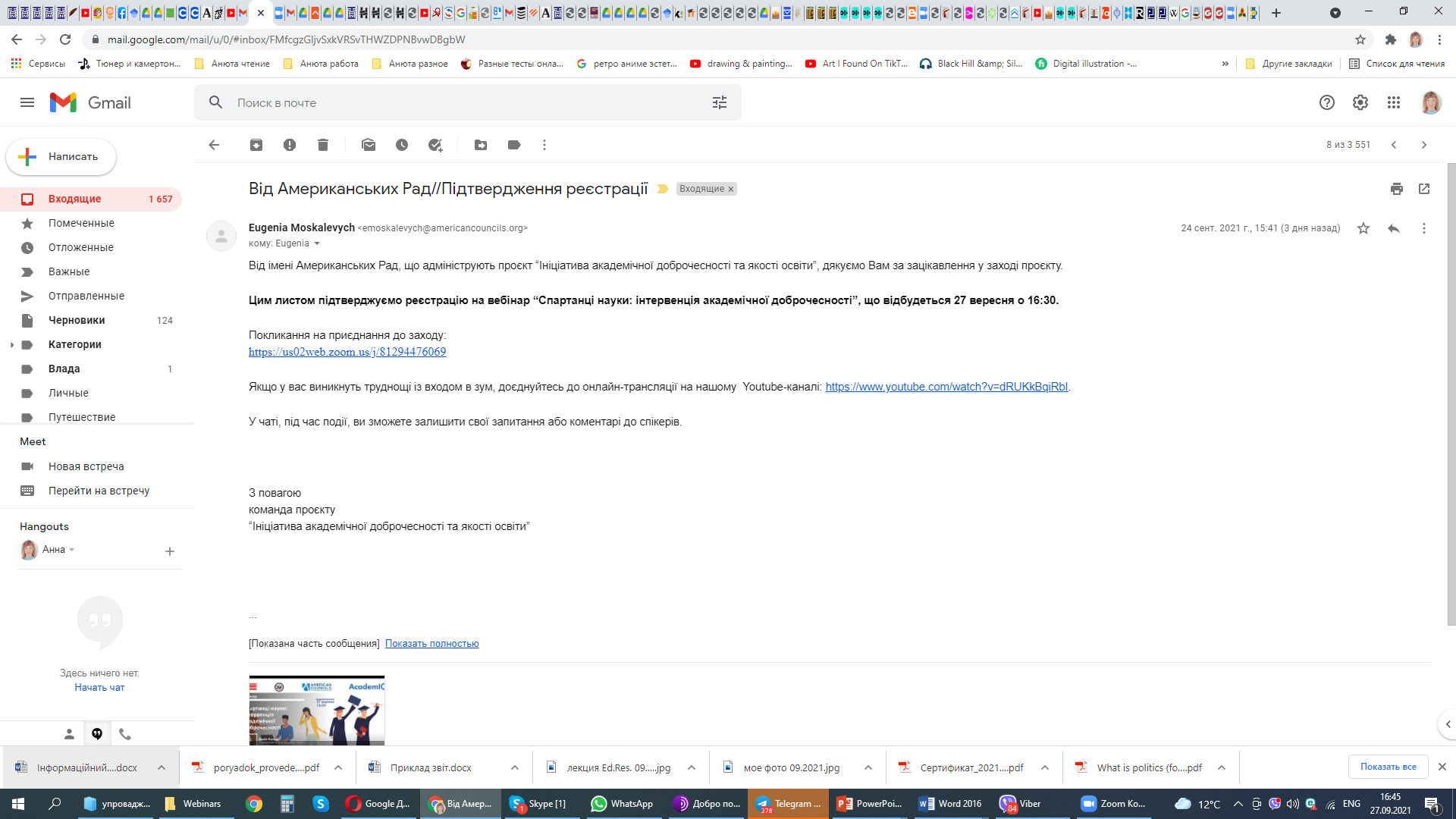 27 вересня о 16.30 кафедра англійської філології та лінгводидактики долучилася до Міжнародного онлайн-вебінару “Спартанці науки: інтервенція академічної доброчесності” у межах проєкту “Ініціатива академічної доброчесності та якості освіти”, який адмініструють Американські Ради (представник кафедри на заході – к.пед.н., доцент Г.І. Подосиннікова).