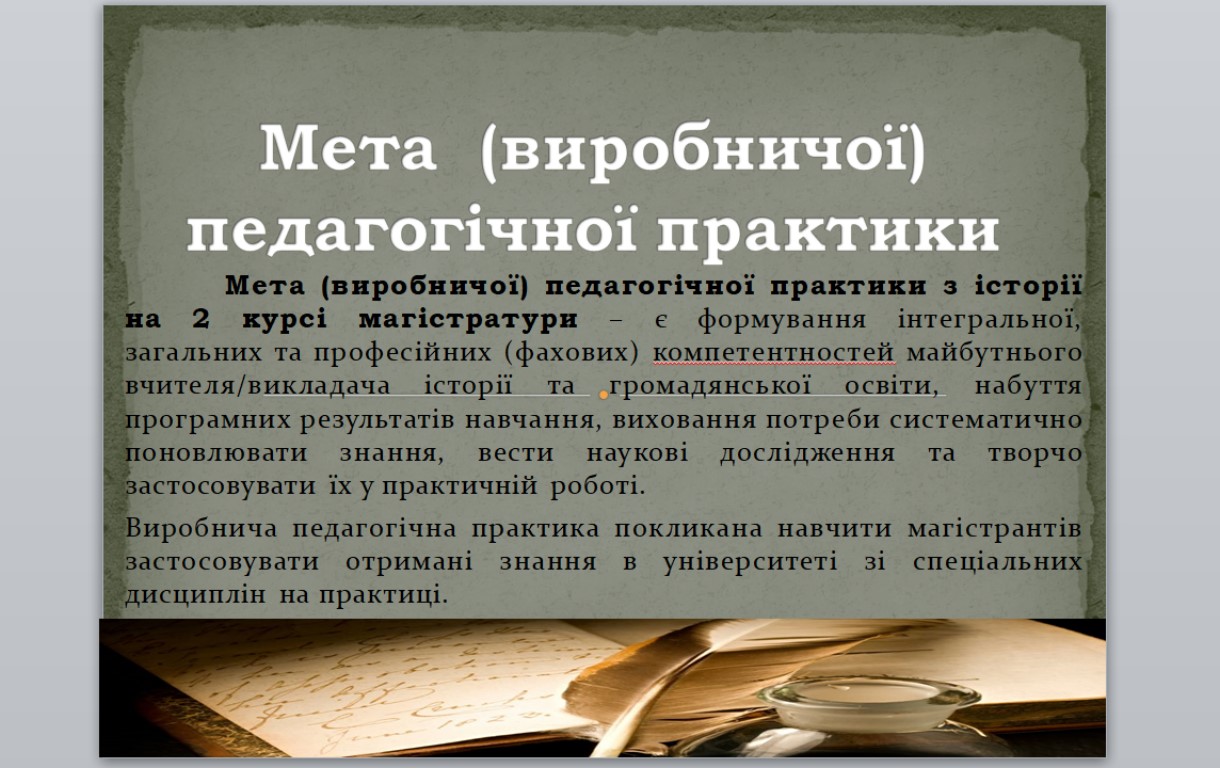 Керівник практики, кандидат педагогічних наук, завідувач кафедри всесвітньої історії, міжнародних відносин та методики навчання історичних дисциплін Світлана Іванівна Моцак ознайомила студентів із робочою програмою практики, Положенням про організацію педагогічної практики та завданнями практики.