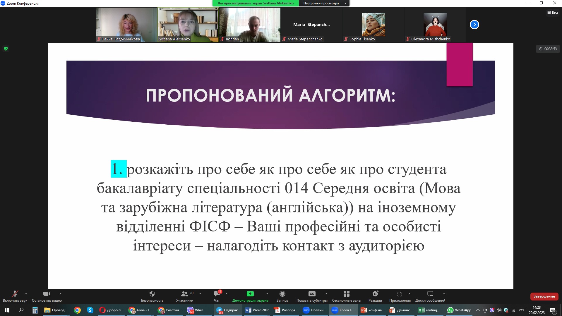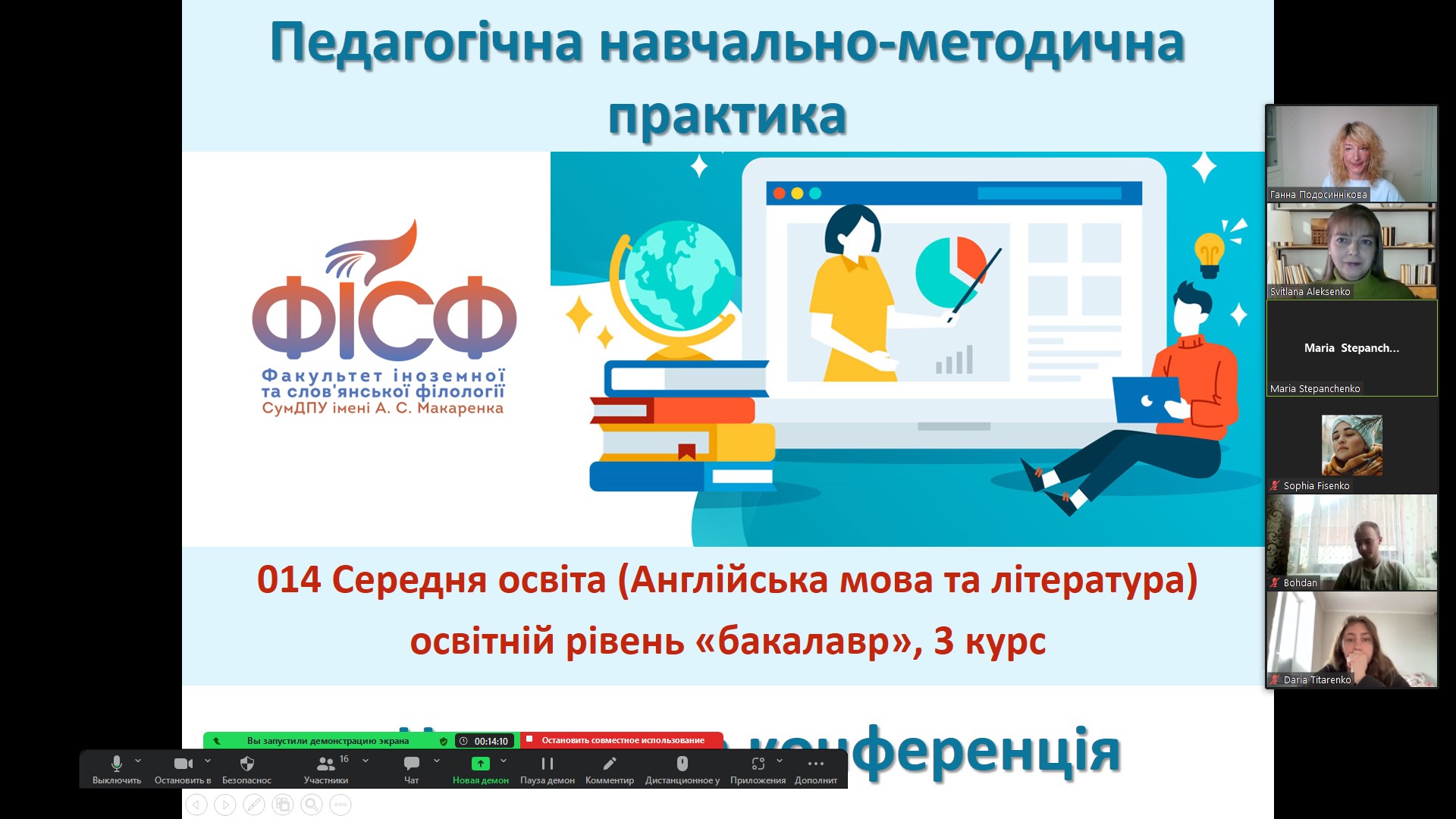 20 лютого 2023 р. на платформі Zoom відбулася настановна конференція з педагогічної навчально-методичної практики в закладах загальної середньої освіти для здобувачів освіти 3 курсу освітньо-професійної програми Середня освіта (Англійська та німецька мови) першого (бакалаврського) рівня вищої освіти спеціальність: 014 Середня освіта (Мова і література (англійська)) спеціалізація: 014.021 Середня освіта (Англійська мова і література) галузі знань 01 Освіта/Педагогіка кафедри англійської філології та лінгводидактики Сумського державного педагогічного університету імені А. С. Макаренка.