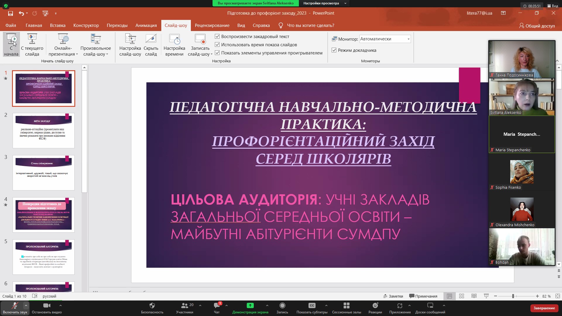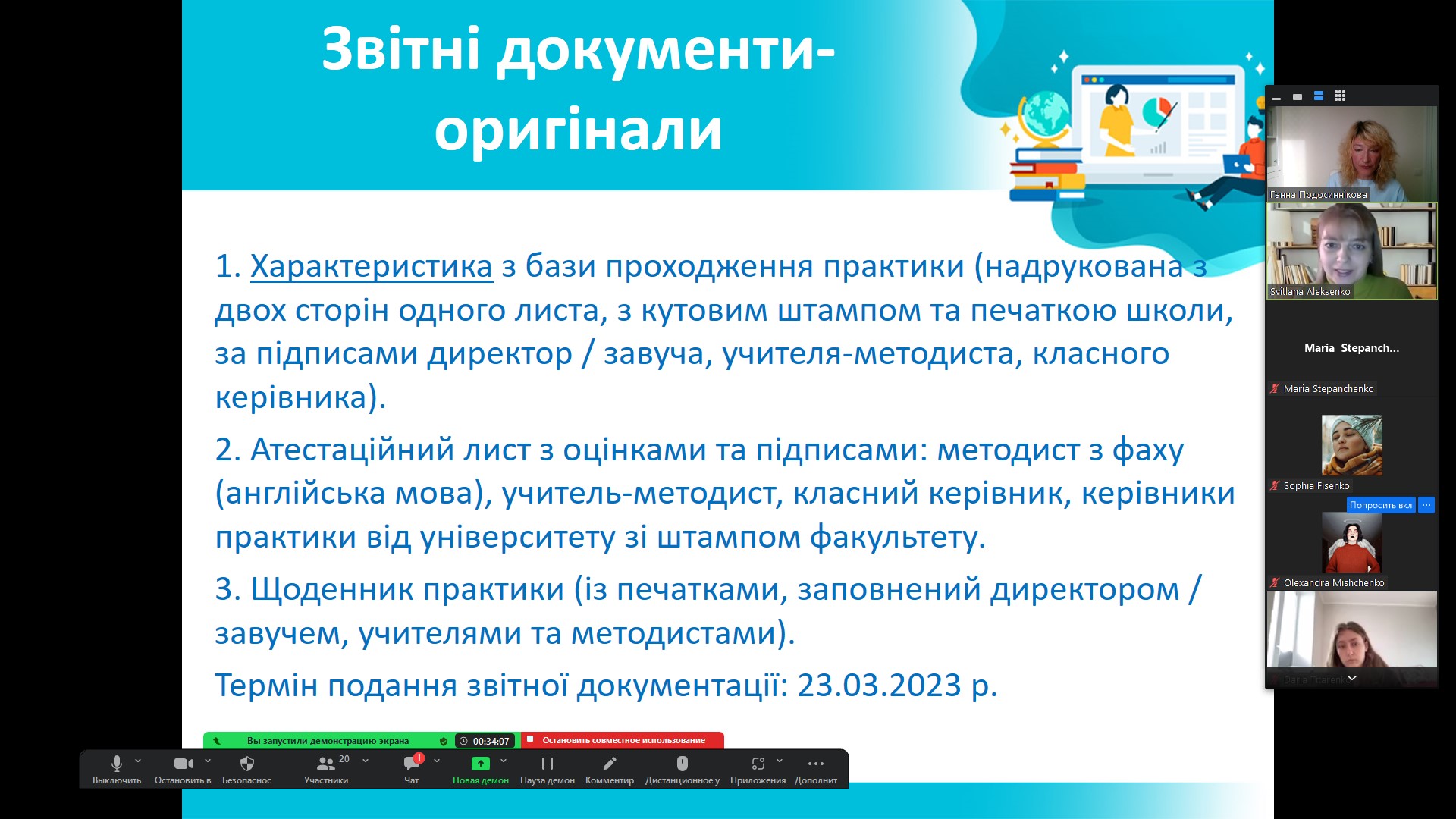 Студенти мали змогу поставити питання щодо оформлення матеріалів практики, подання ключових звітних документів за умов дистанційного навчання, загальними особливостями навчального процесу та проведення уроків під час воєнного стану.