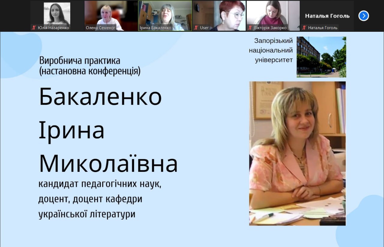 Бакаленко Ірина Миколаївна, кандидат педагогічних наук, доцент кафедри української літератури Запорізького національного університету, поділилася власним досвідом проведення практики та розповіла про зміни у кількості уроків та загальні зміни.