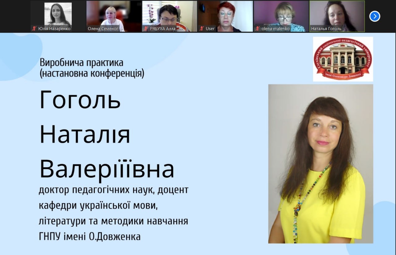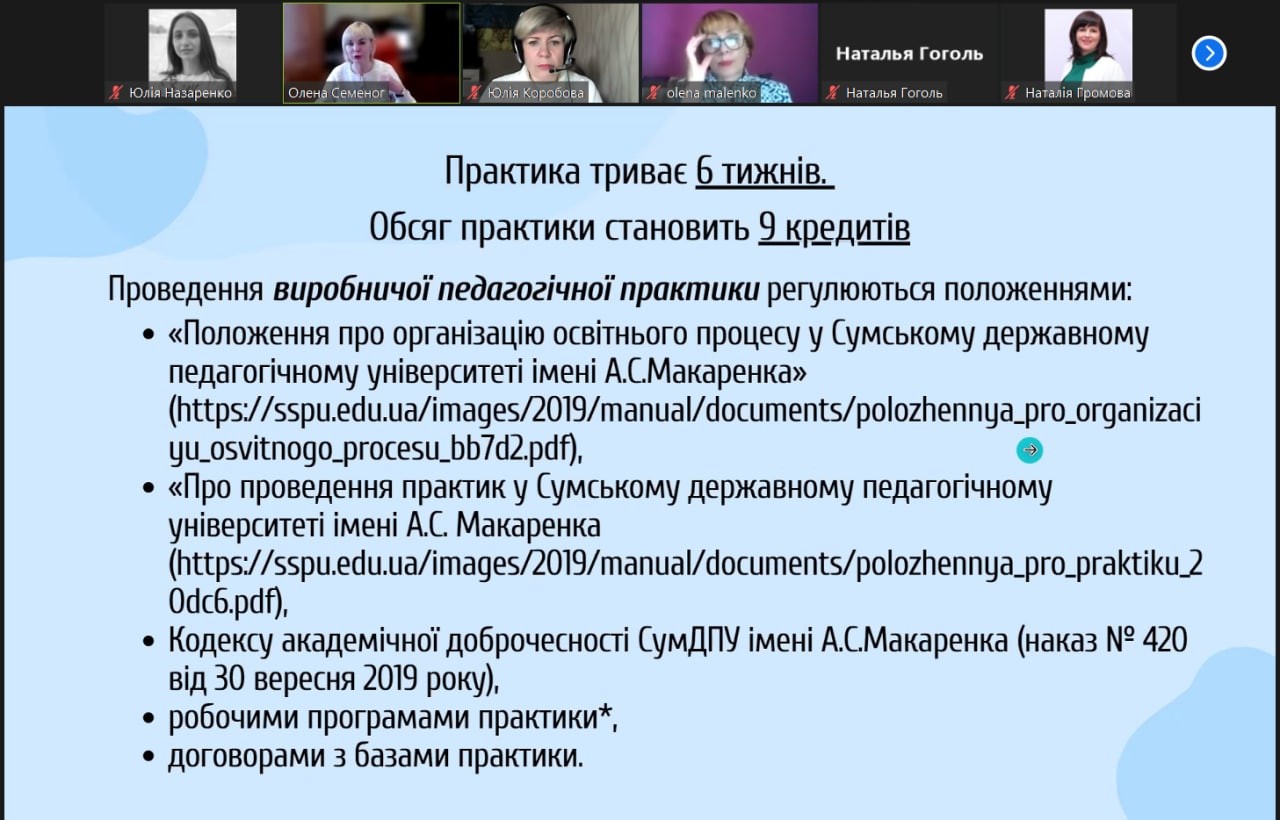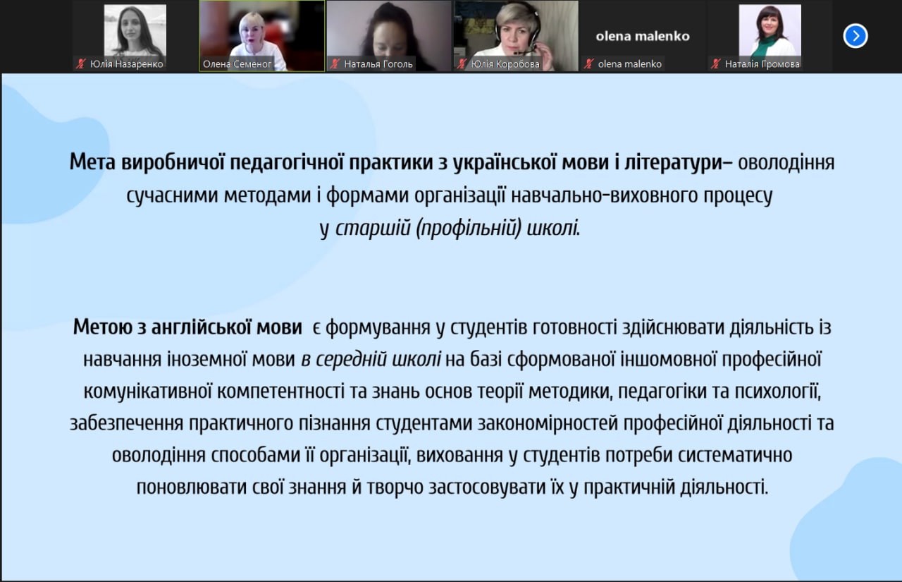 Методисти практики та модератори заходу Семеног Олена Миколаївна, д. пед. н., професор, завідувач кафедри української мови і літератури, та Коробова Юлія Володимирівна, канд. пед. наук, старший викладач кафедри практики англійської мови, окреслили мету практики, нормативні документи, ознайомили студентів із специфікою проведення уроків з української мови і літератури, англійської мови, надали необхідні та корисні ресурси для кращої підготовки.