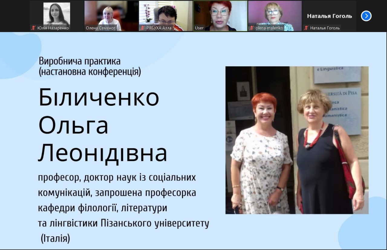 Із Біличенко Ольгою Леонідівною, професором, доктором наук із соціальних комунікацій, професоркою кафедри філології, літератури та лінгвістики Пізанського університету (Італія), обговорили безпекові заходи, пов’язані із теперішніми реаліями, в тому числі зменшену кількість уроків та допомогу практикантам із підготовкою навчальних матеріалів до уроків.