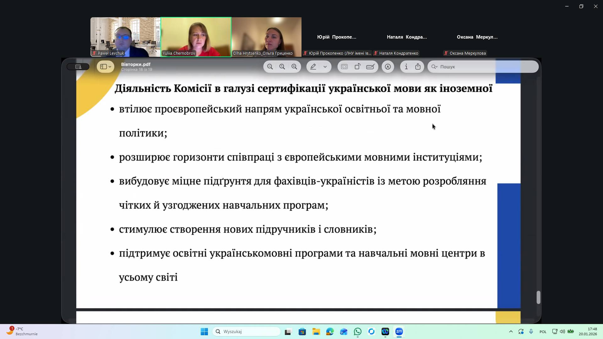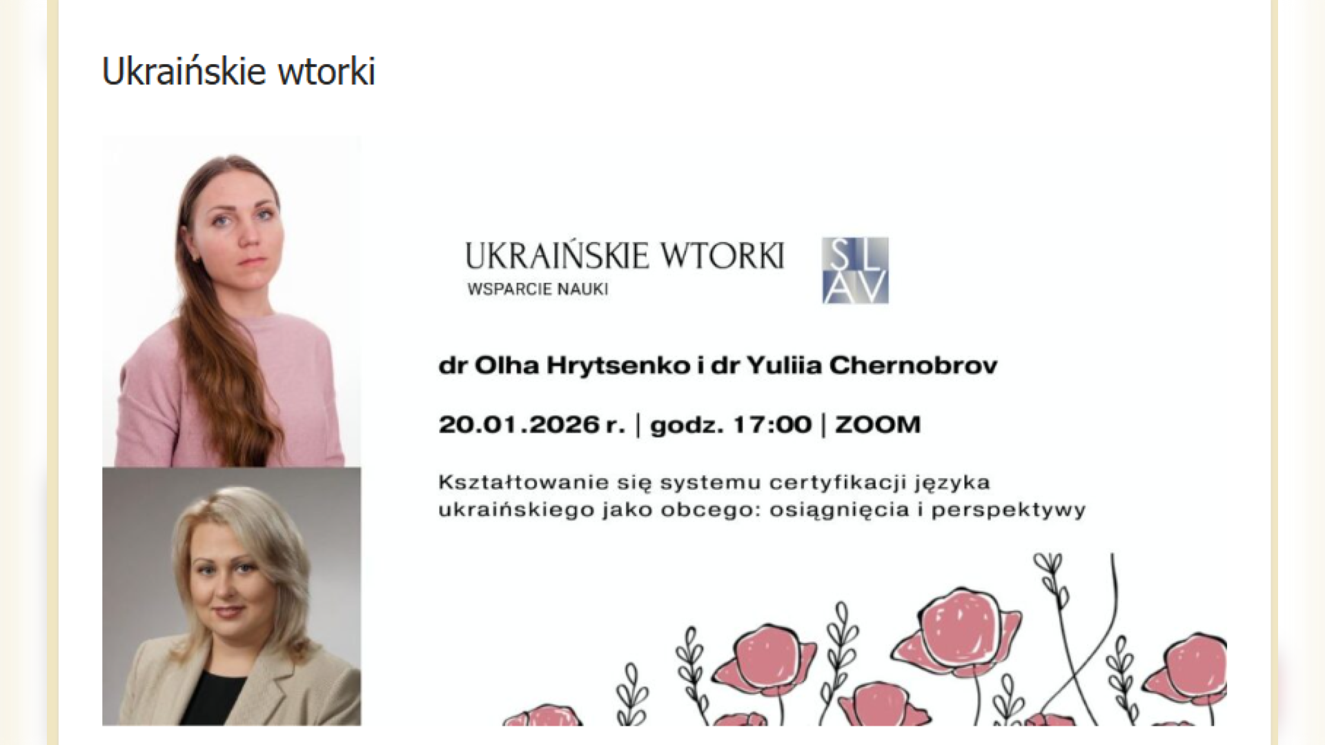 20 січня 2026 року на запрошення мовознавця, славіста, доцента кафедри мовознавства Інституту славістики Польської академії наук (PAN) Polska Akademia Nauk (PAN) Павла Левчука Paweł Lewczuk викладачі, аспіранти кафедри педагогіки, кер. Центру науково-освітнього партнерства та мережевої взаємодії, проф. Олена Семеног долучилися до участі в семінарі серії «Українські вівторки» («Ukraińskie wtorki»), Захід відбувся на базі Інституту славістики Польської академії наук (PAN).