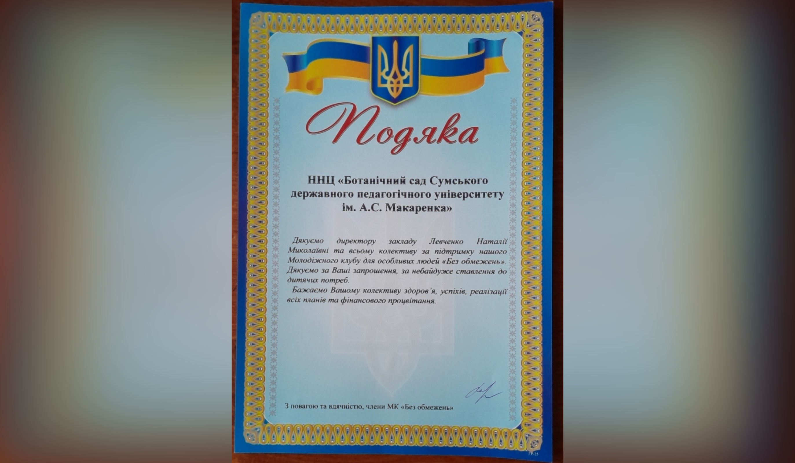 А сьогодні працівники ННЦ «Ботанічний сад СумДПУ імені А.С. Макаренка» були приємно здивовані, отримавши Подяку від членів МК «Без обмежень».
