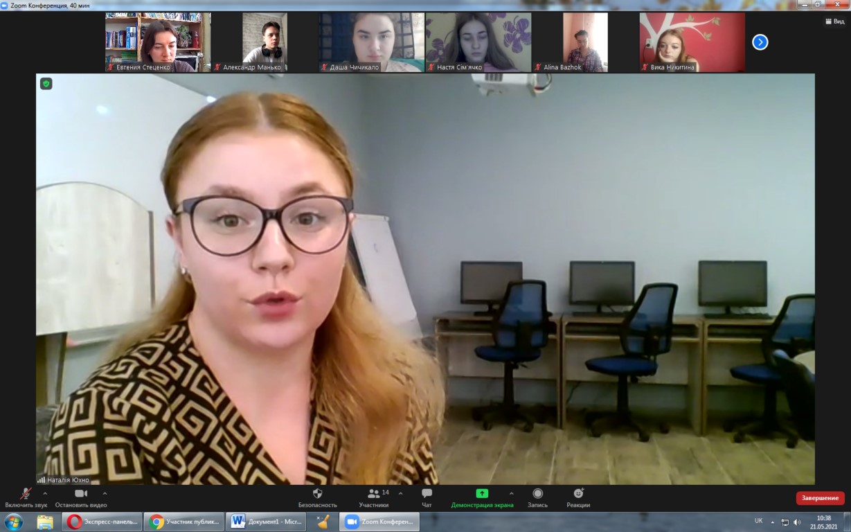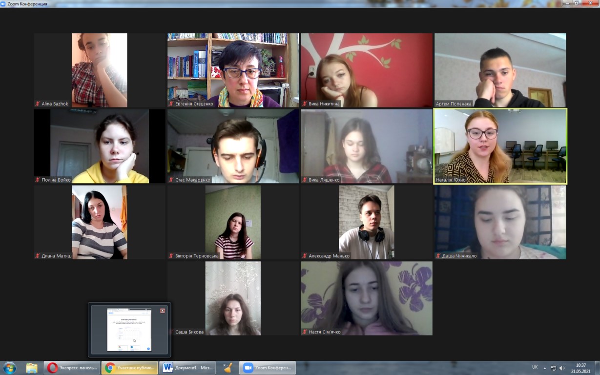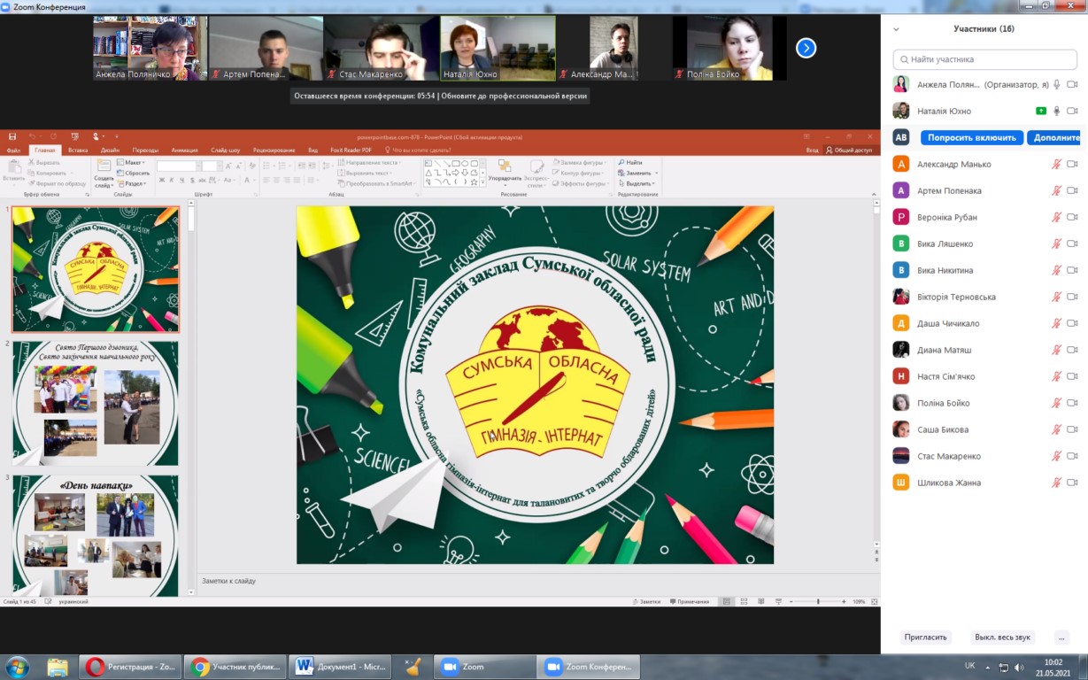 21 травня 2021 року в рамках вивчення дисциплін «Інституційне забезпечення соціальної роботи і соціальної допомоги» та «Інституційне забезпечення соціокультурної діяльності» (викладач – завідувач кафедри соціальної роботи і менеджменту соціокультурної діяльності, к.п.н., доц. Поляничко А.О.) відбулося онлайн-знаймство студентів І курсу спеціальностей «Соціальна робота», «Соціальне забезпечення» і «Менеджмент соціокультурної діяльності» з діяльністю КЗ СОР «Сумська обласна гімназія-інтернат для талановитих та творчо обдарованих дітей».