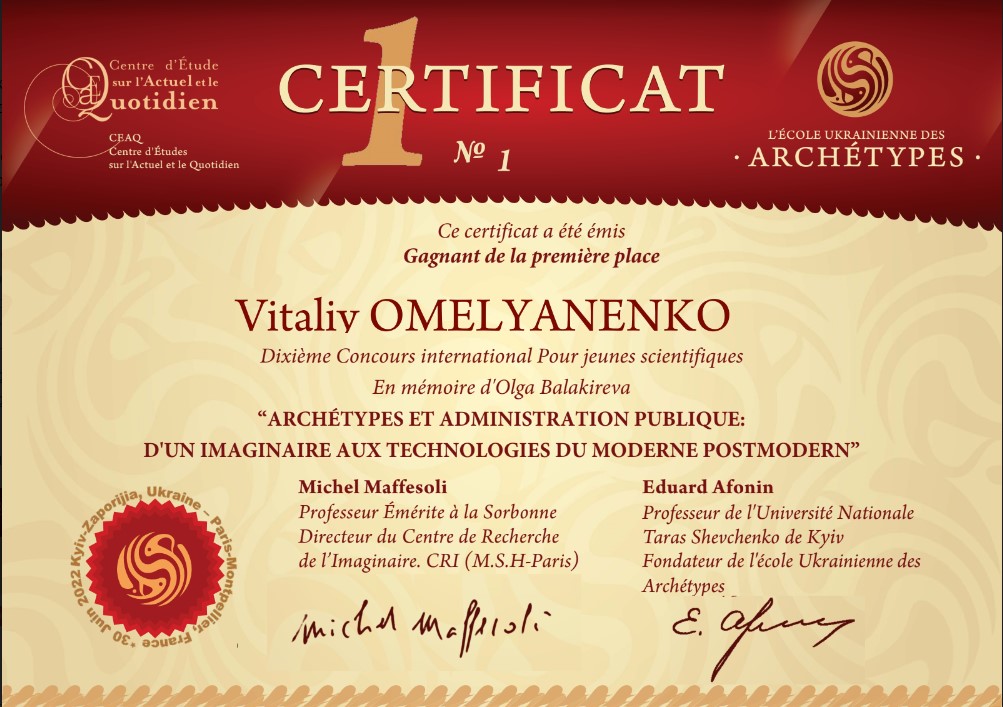 За підсумками Х Міжнародного франко-українського конкурсу досліджень молодих науковців в сфері публічного управління пам’яті Ольги Балакірєвої, що відбувся під патронатом Університету Сорбонни, наукове дослідження доцента кафедри бізнес-економіки та адміністрування, керівника Навчально-наукового центру проєктних технологій СумДПУ імені А.С. Макаренка, д.е.н., доц.