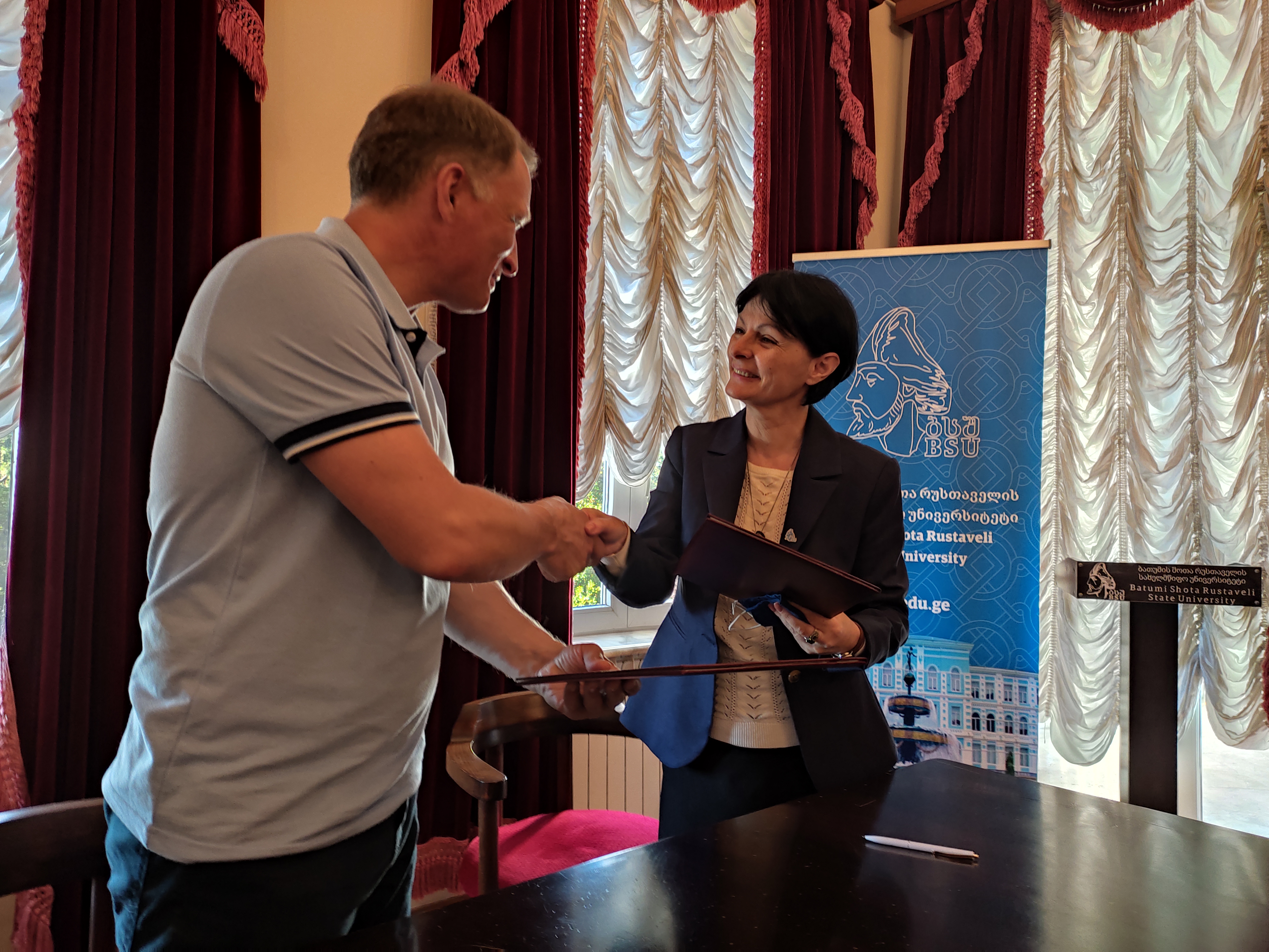 7 червня 2021 року делегація СумДПУ імені А.С. Макаренка на чолі з ректором, професором Лянним Ю.О. у складі завідувача кафедри Права та МВП Іваній О.М., завідувача кафедри Теорії і методики спорту Бермудес Д.В., начальника відділу кадрів Пустовіт Л.В., в.о. завідувача кафедри бізнес-економіки та адміністрування професора Божковой В.В. і вченого секретаря Скиби О.О. відвідала Батумській державний університет і взяла участь у перемовах з керівництвом університету. Результатами перемовин стало підписання договору про наукову, навчальну, грантову співпрацю між двома університетами.