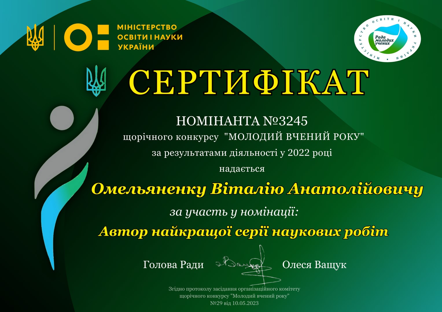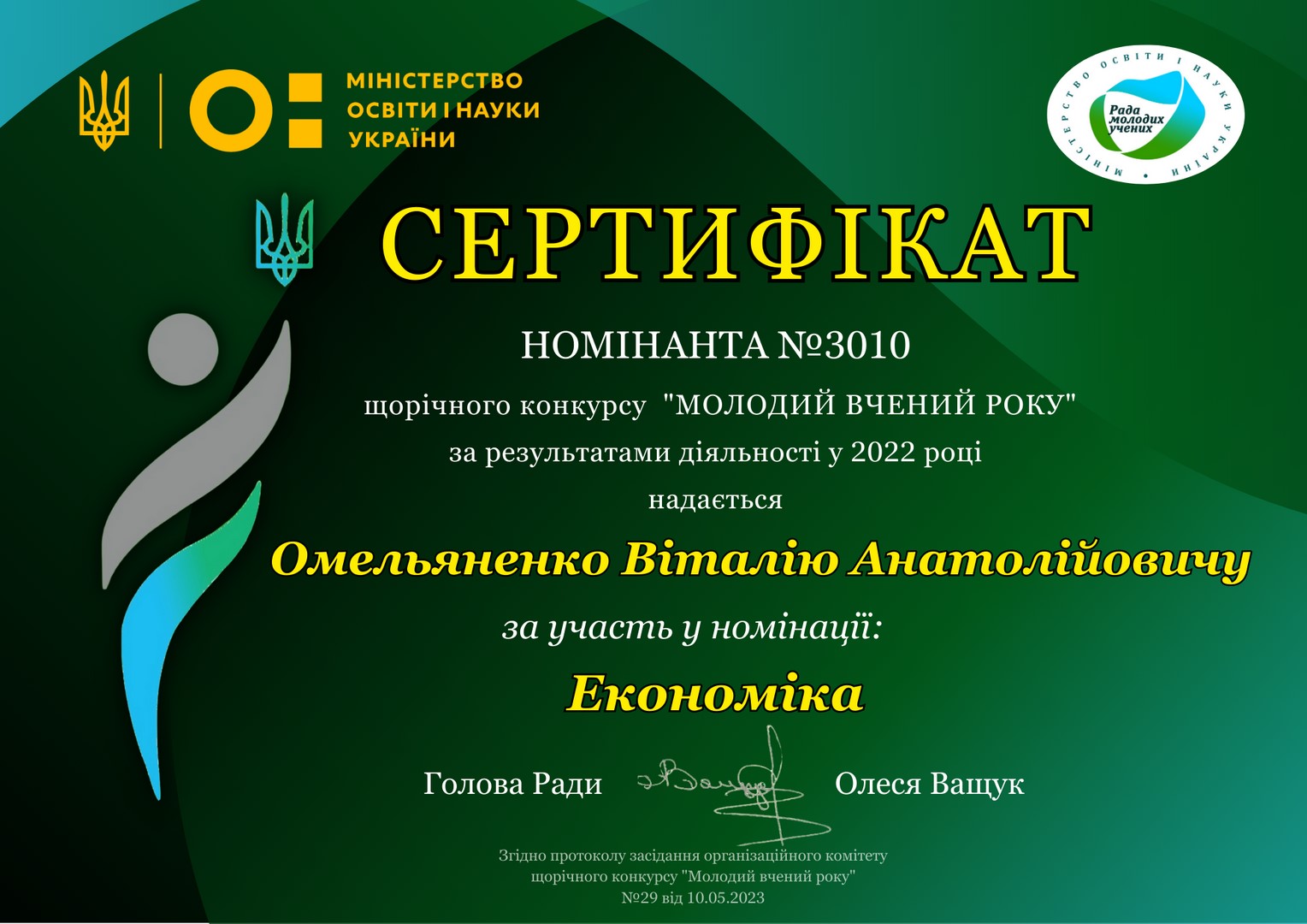 Керівник Навчально-наукового центру проєктних технологій СумДПУ імені А.С. Макаренка, доцент кафедри бізнес-економіки та адміністрування, д.е.н., доц. Віталій ОМЕЛЬЯНЕНКО за результатами проведення Всеукраїнського конкурсу "Молодий вчений року - 2022" посів 3 місце одразу у двох номінаціях з високою конкуренцією - "Автор найкращої серії наукових робіт" та "Економіка".