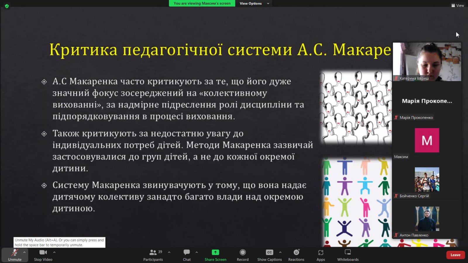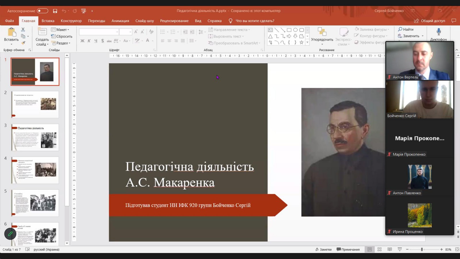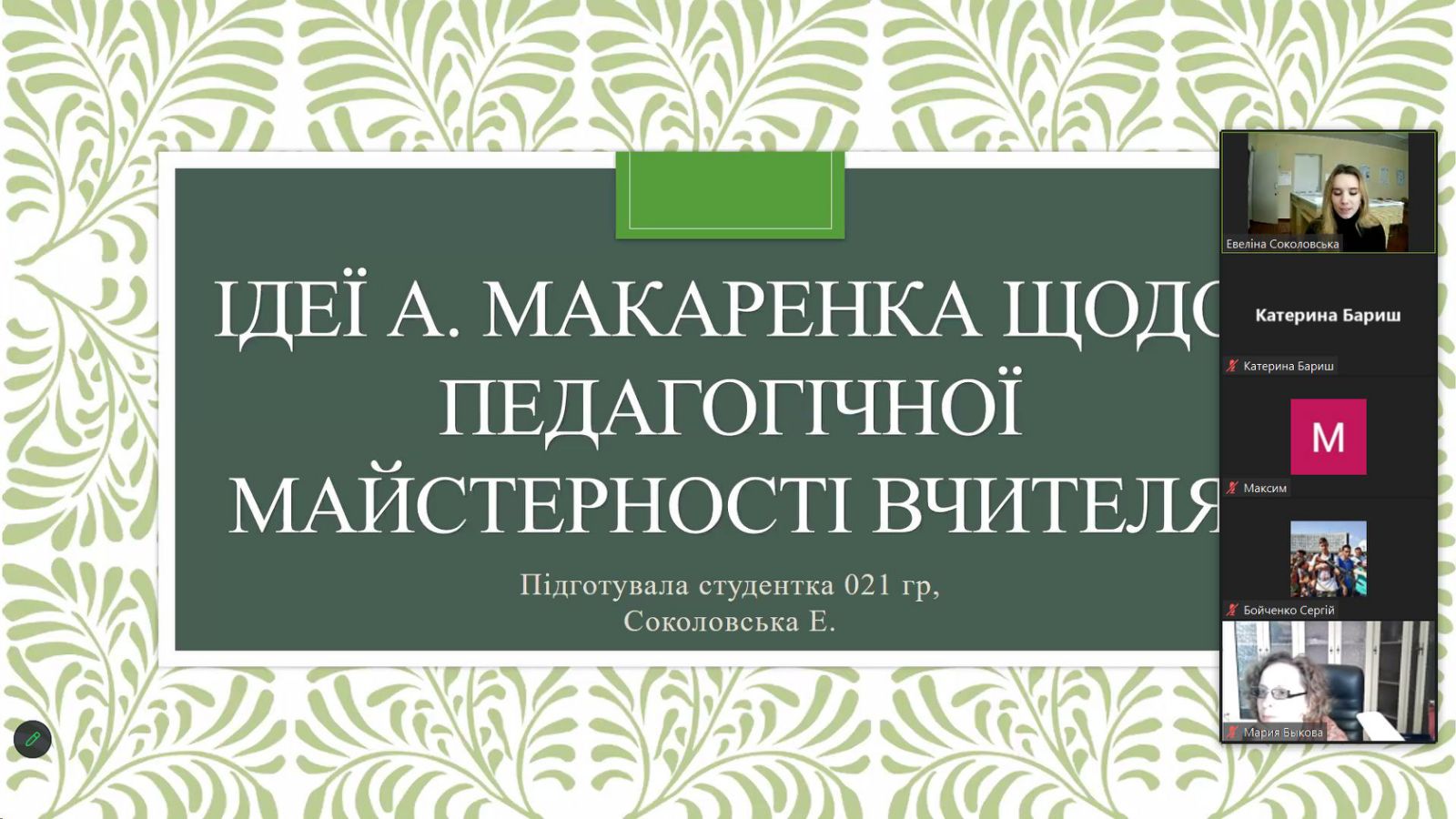 Науковий семінар об’єднав зусилля студентської молоді та широкого кола науковців і практиків у обговоренні актуальних проблем виховання, що здійснюються в умовах воєнного стану з використанням історичних уроків педагогічної спадщини А.С. Макаренка. Серед різноманіття питань, що обговорювалися під час заходу: проблеми цінностей, напрями і завдання виховання, складнощі соціалізації, роль родини та закладів освіти у формуванні особистості, осмислення історичного виховного досвіду, його здобутків і прорахунків. Педагогічна рефлексія продемонструвала актуальність піднятих проблем у формуванні особистісних рис майбутніх педагогів, сприяла подальшому розвиткові професійних умінь як молодих педагогів-науковців, так і досвідчених педагогічних працівників.