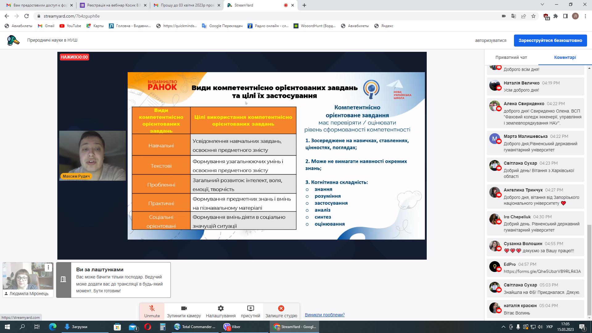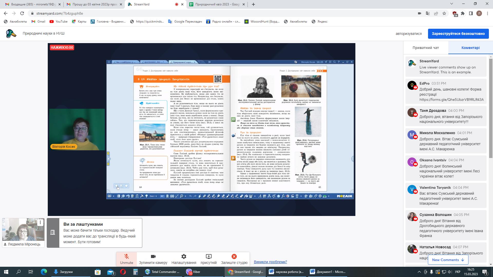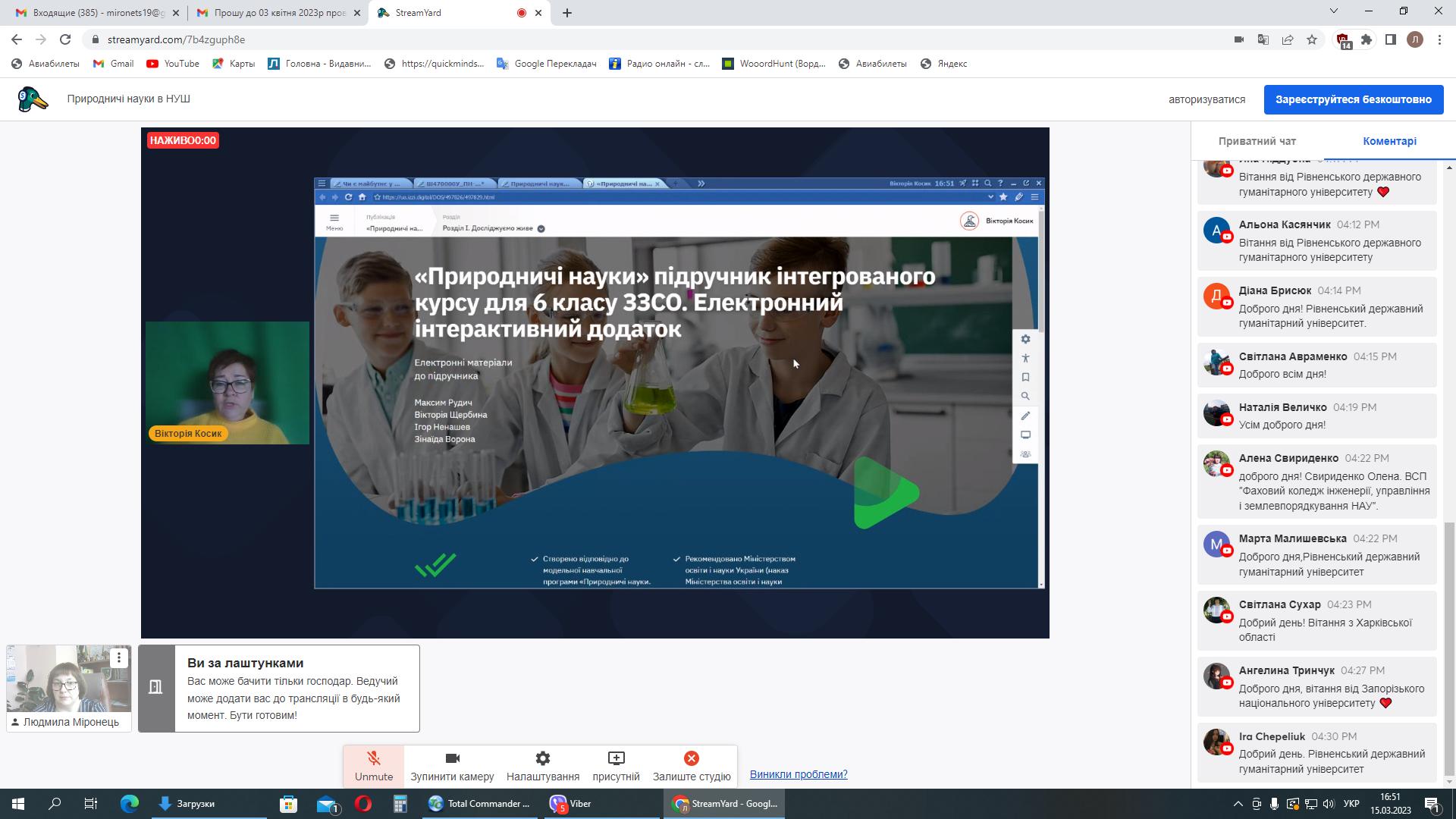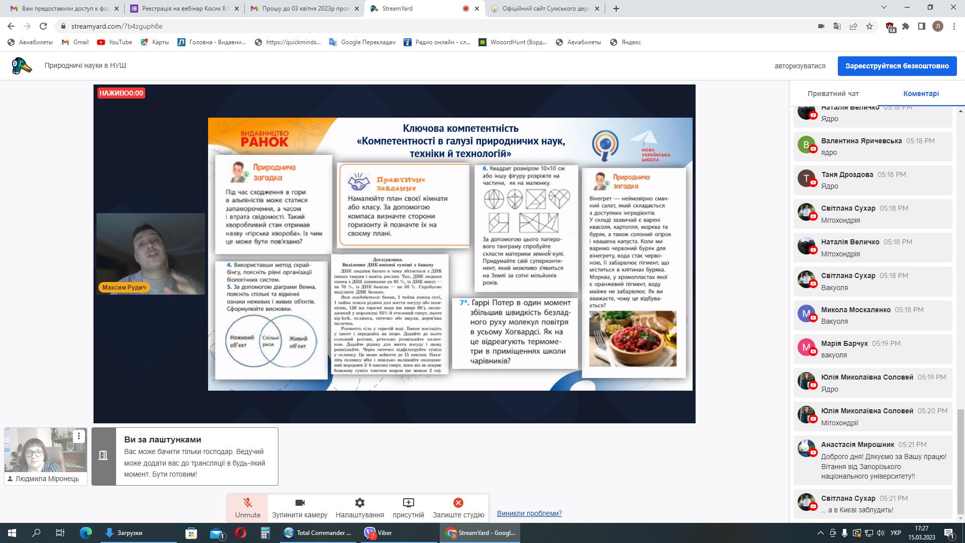 15 березня 2023 року серію вебінарів із авторами модельних програм та підручників для НУШ природничої освітньої галузі продовжила зустріч із Вікторією Косик, освітньою технологинею, авторкою посібників та підручників з географії, підручників «Природничі науки» для 5-6 класів НУШ, ст. викладачкою кафедри природничо-математичної освіти і технологій ІПО КУБГ, проєктною менеджеркою команди підтримки реформ МОН України та Максимом Рудич, теле-радіоведучим, науковим співробітником Національної академії педагогічних наук України, співавтором підручників з біології та природничих наук, тренером НУШ.