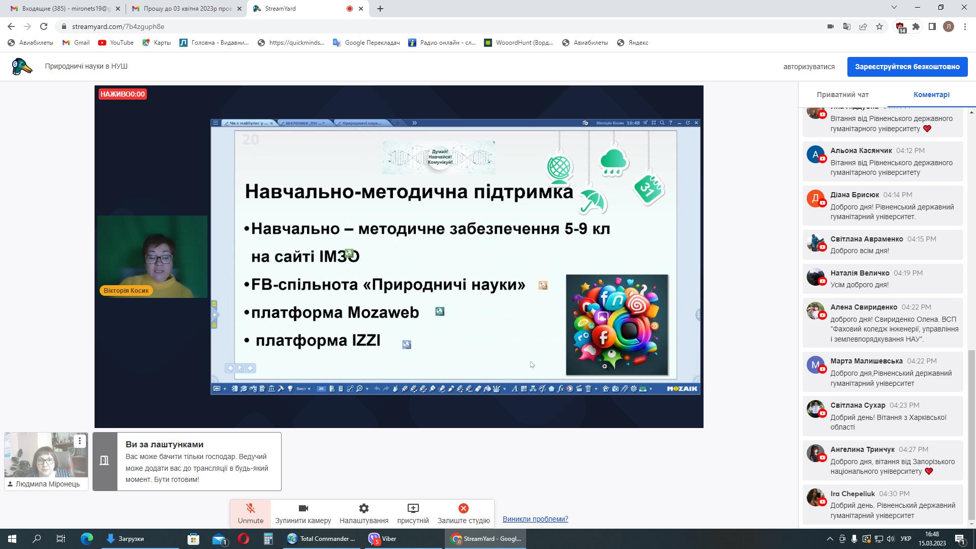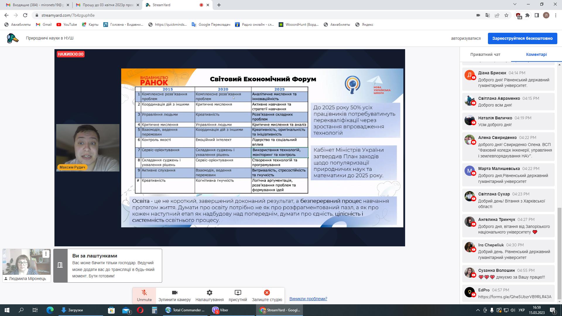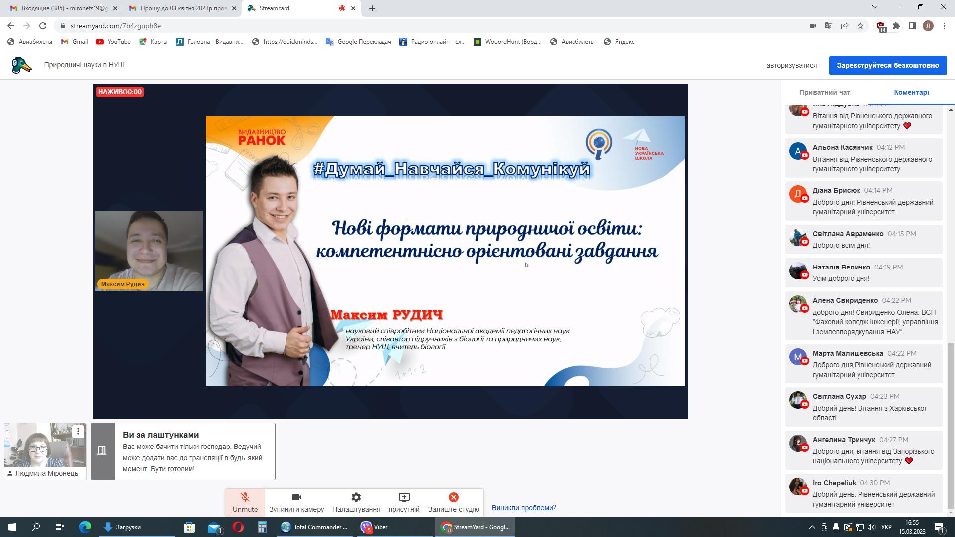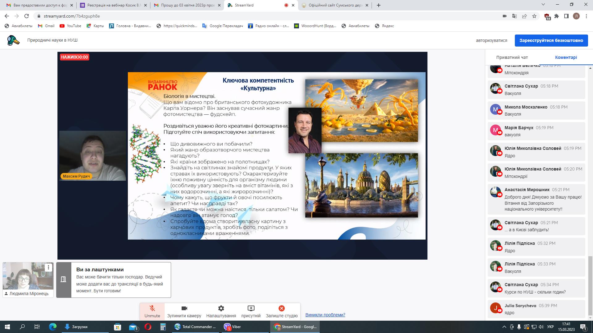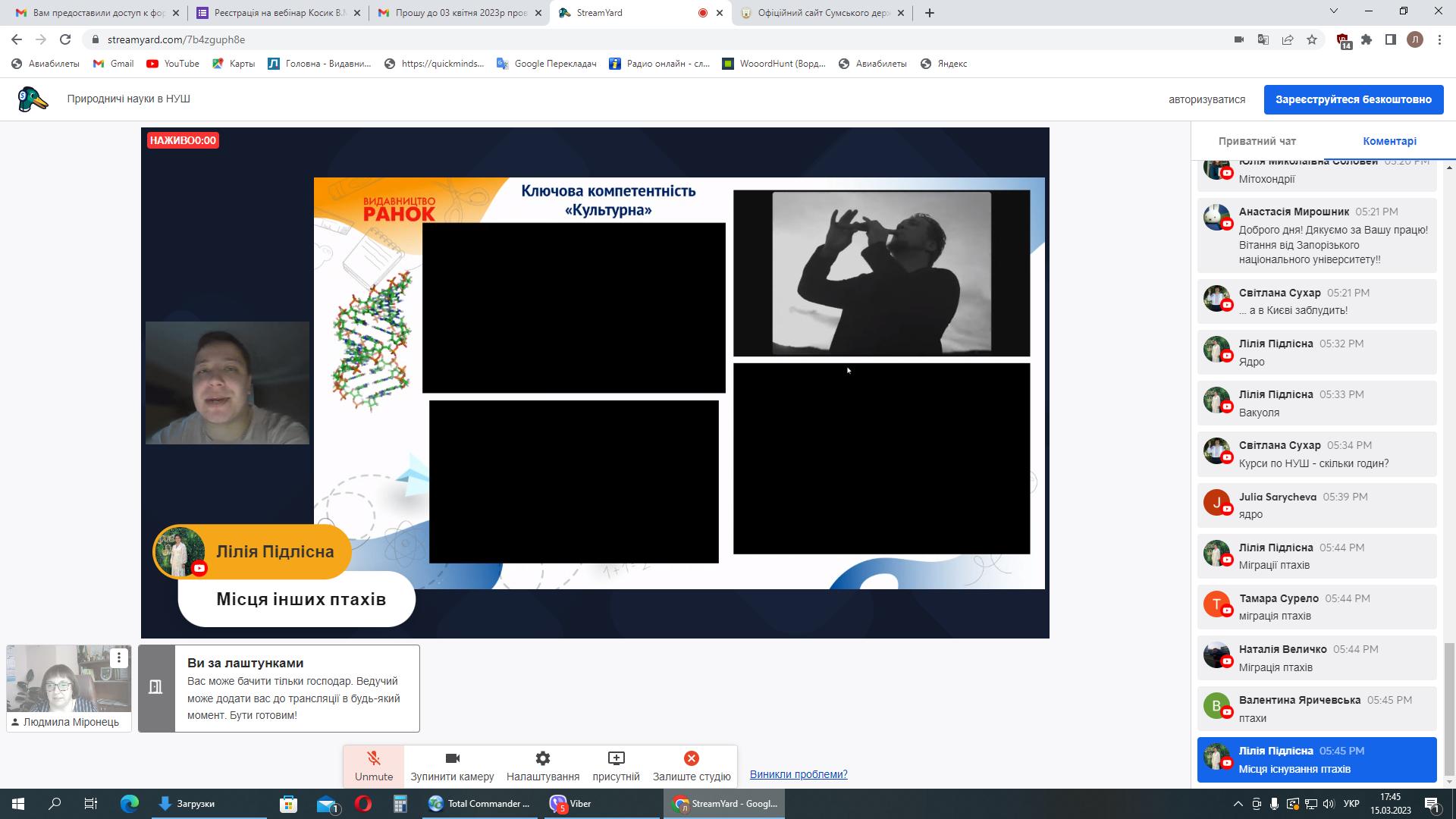 Вперше ми працювали за допомогою сервісу StreamYard, який нам люб’язно надала компанія EdPro – український виробник обладнання для освіти, програмного забезпечення та інтерактивних підручників. Приємно, що долучилися вчителі м. Суми, а також – Сумської, Дніпропетровської, Київської, Харківської, Черкаської, Запорізької, Вінницької та Житомирської областей. На вебінарі були присутні здобувачі освіти освітніх рівнів бакалавр та магістр спеціальностей 014 Середня освіта (Біологія та здоров’я людини), 014 Середня освіта (Географія), 014 Середня освіта (Хімія) природничо-географічного факультету СумДПУ імені А.С. Макаренка, Запорізького національного університету, Тернопільського національного педагогічного університету імені Володимира Гнатюка, Херсонського державного університету, Волинського національного університету імені Лесі Українки, Дрогобицького державного педагогічного університету імені Івана Франка, Глухівського національного педагогічного університету імені Олександра Довженка, Луцького національного технічного університету та Рівненського державного гуманітарного університету.