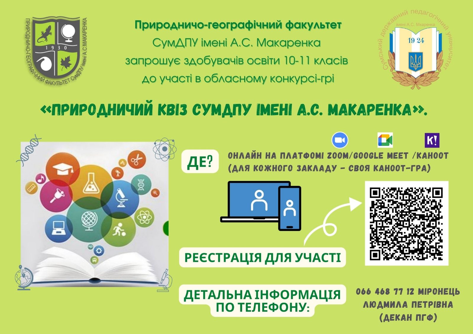 На природничо-географічному факультеті СумДПУ імені А.С. Макаренка триває перший тур обласного конкурсу – гри «Природничий квіз СумДПУ імені А.С. Макаренка» – 2024, яка присвячена 100-річчю СумДПУ імені А.С. Макаренка. У заході беруть участь здобувачі освіти 10-11 класів закладів загальної середньої, позашкільної, передвищої (фахової), професійно-технічної освіти.