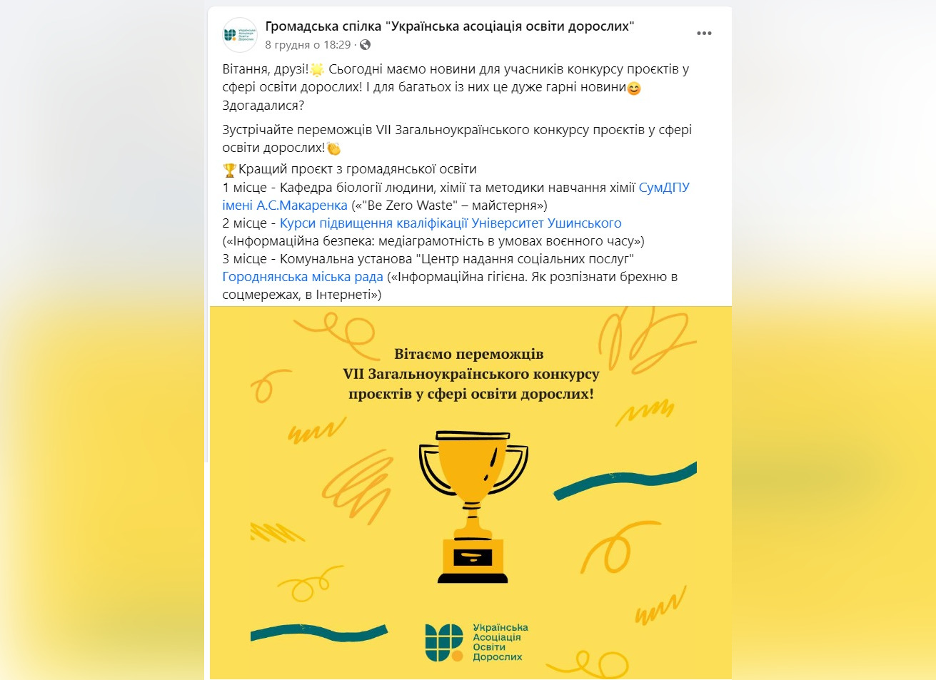16 грудня 2023 у м. Київ відбулося підбиття підсумків та нагородження переможців VII Загальноукраїнського конкурсу проєктів у сфері освіти дорослих, оголошеного Громадською спілкою "Українська асоціація освіти дорослих" за підтримки Представництва DVV International в Україні.