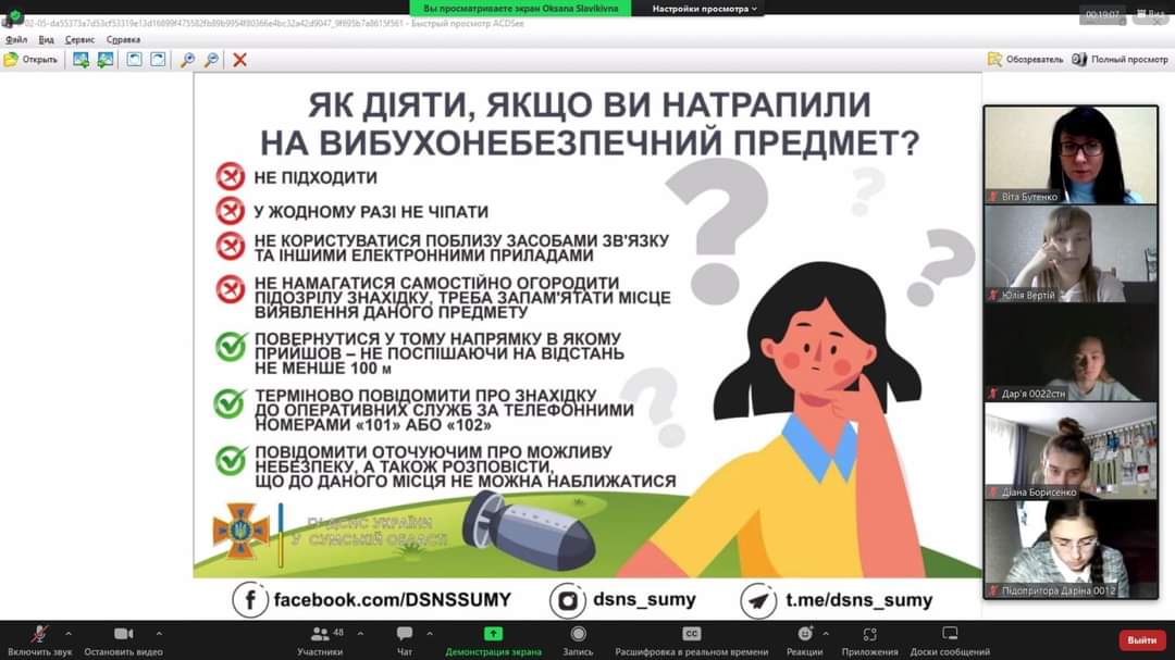 Так, 26 вересня 2022 року за ініціативи викладачів кафедри психології для кваліфікованого роз’яснення на зустріч зі студентами було запрошено фахівців – ст. лейтенанта Марину ГОРЬКОВСЬКУ (інспектор сектору зв’язків з громадськістю управління патрульної поліції в Сумській області) та підполковника Євгенія МОГИЛЕНЦЯ (провідний фахівець сектору зв’язків із засобами масової інформації та роботи з громадськістю Головного управління Державної служби надзвичайних ситуацій України у Сумській області). Запрошені спеціалісти надали студентству інформацію про дотримання населенням правил техніки безпеки під час війни і правила поводження на блокпостах, необхідність світломаскування і небезпеку відвідування лісів та водойм, особливості спілкування у соціальних мережах в умовах воєнного стану тощо. Також фахівцями була продемонстрована презентація про вибухонебезпечні предмети, перегляд якої дозволив присутнім з’ясувати: як виглядають міни, розтяжки та інші боєприпаси; під які предмети можуть бути замасковані вибухові пристрої та ін. Наприкінці зустрічі студентів і викладачів кафедри психології було ознайомлено з переліком захисних споруд та укриттів в місті Суми.