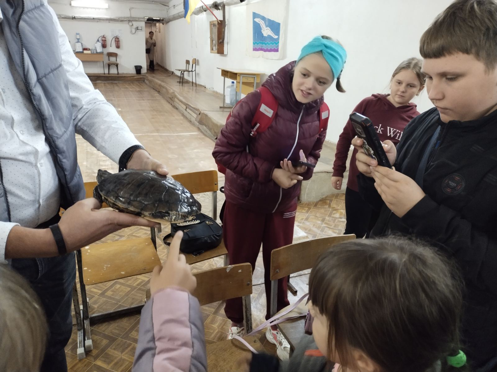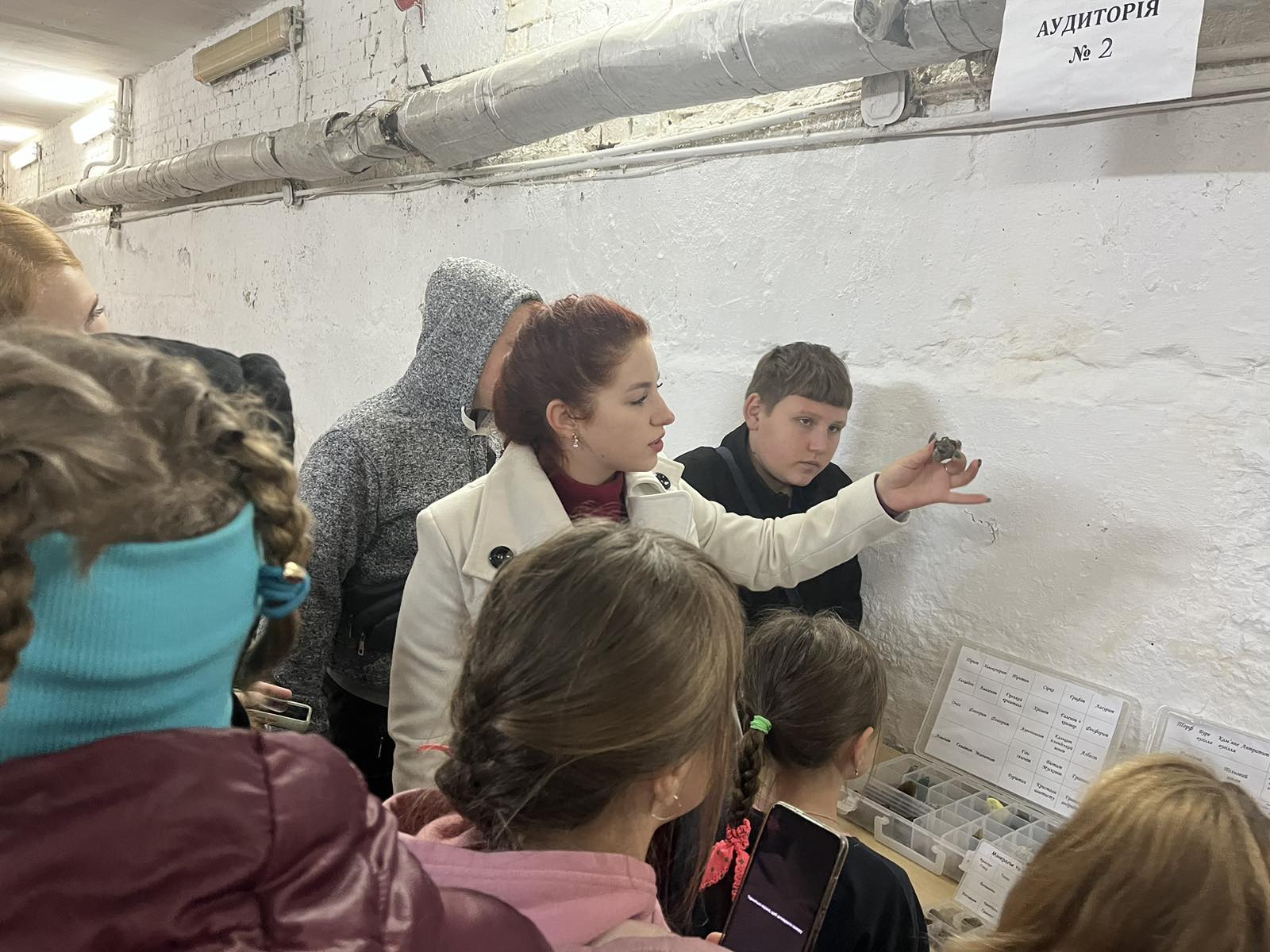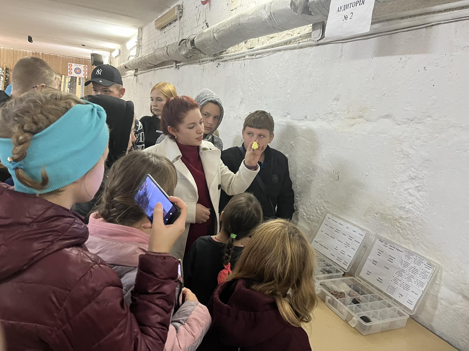 Графік відвідування був завчасно продуманий та погоджений із адміністраціями обох закладів. Зміни до графіку відвідування внесла оголошена у нашому регіоні повітряна тривога. Але викладачі та співробітники ПГФ не розгубилися і продовжили роботу з учнями у нашому укритті. Під час повітряної тривоги діти спустилися в бомбосховище, де екскурсовод показала переносні геологічні колекції мінералів, гірських порід та палеонтологічних решток. Діти зацікавилися зубами акули та переглядали різнокольорові зразки флюориту, яскраву сірку, кристалічні кальцит та гіпс.