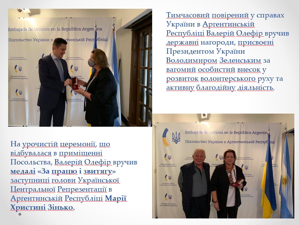 У квітні цього року тимчасовий повірений у справах України в Аргентинській Республіці Валерій Олефір вручив Марії Христині Зінько медаль «За працю і звитягу», присвоєну Президентом України Володимиром Зеленським за вагомий особистий внесок у розвиток волонтерського руху та активну благодійну діяльність.