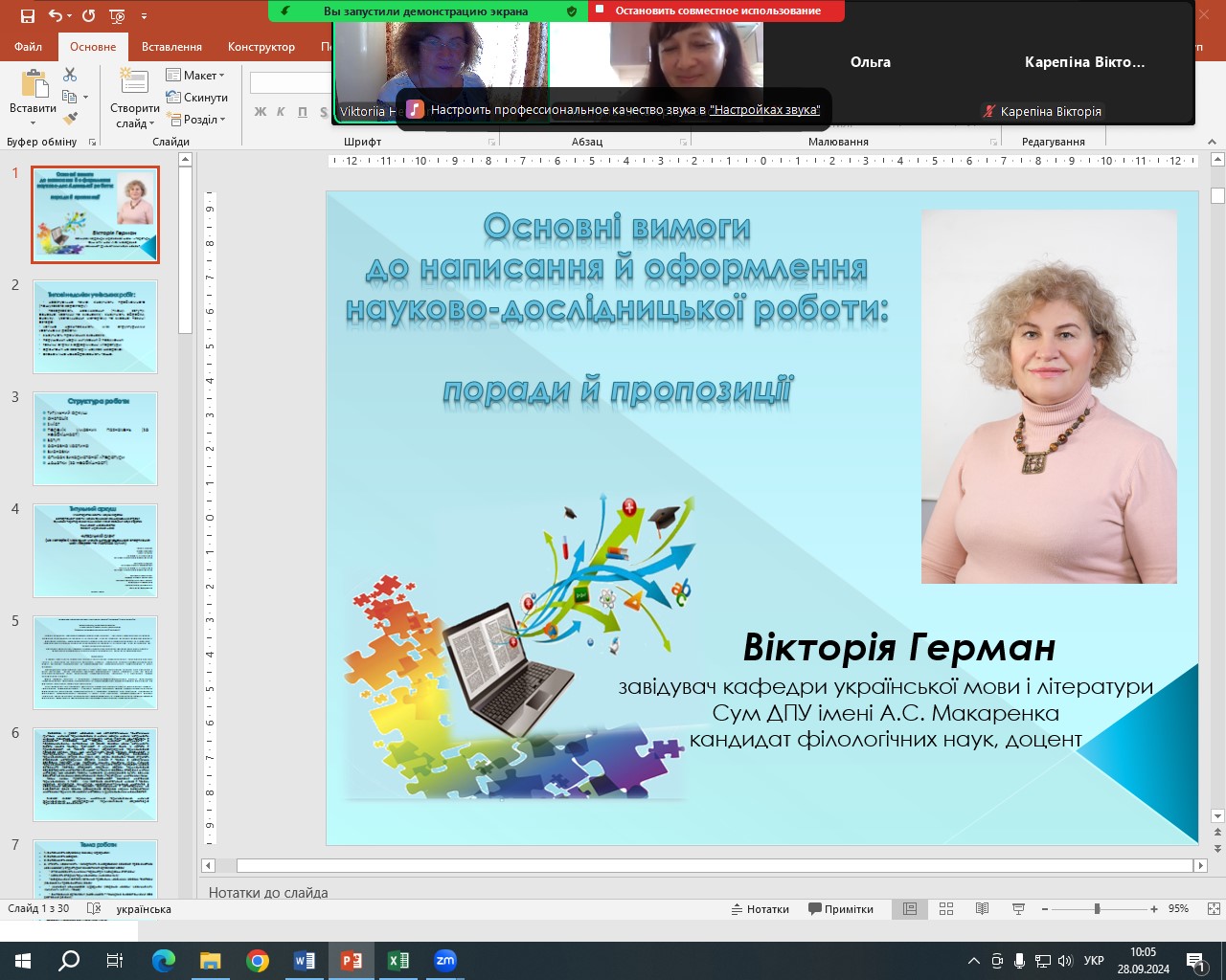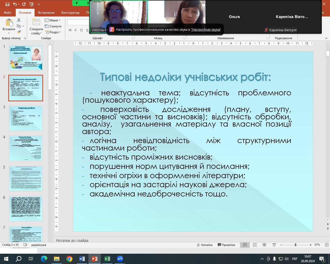 - прочитала гостьову онлайн лекцію «Основні вимоги до написання й оформлення науково-дослідницької роботи» для вчителів-керівників, стейкхолдерів із різних громад Сумської області;