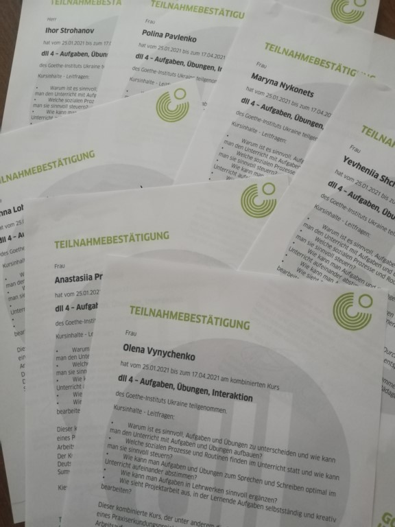 Керівництво Факультету іноземної та слов’янської філології Сумського державного педагогічного університету імені А.С. Макаренка та кафедра германської філології вітає студентів третього курсу з успішним завершенням курсу DLL4 «Aufgaben, Übungen, Interaktion» у міжнародній програмі Goethe-Institut «Deutsch lehren lernen» («Вчимося навчати німецької»): Валерію Бугаєвську, Олену Виниченко, Ганну Логвіненко, Марину Ніконець, Поліну Павленко, Анастасію Проніну, Ігоря Строгонова та Євгенію Щербак.