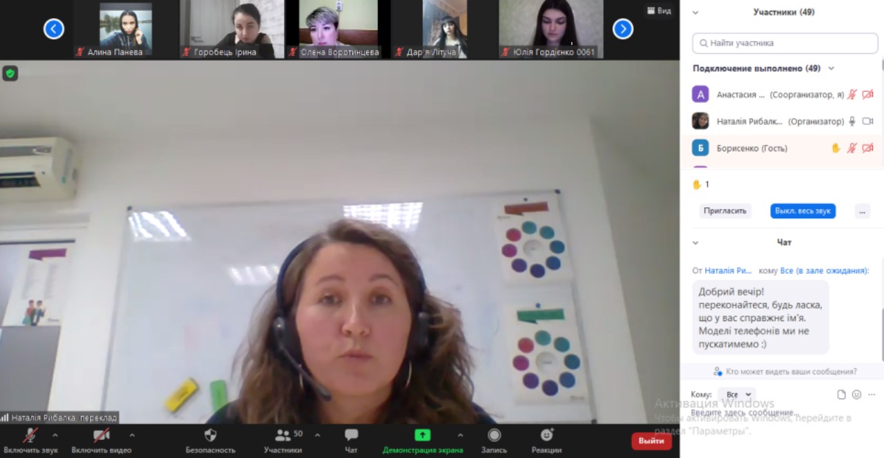 Перекладає вебінар з англійської мови на українську. Рибалка Наталія Сергіївна, кандидат філологічних наук, доцент кафедри теорії та практики перекладу Черкаського національного університету імені Богдана Хмельницького.