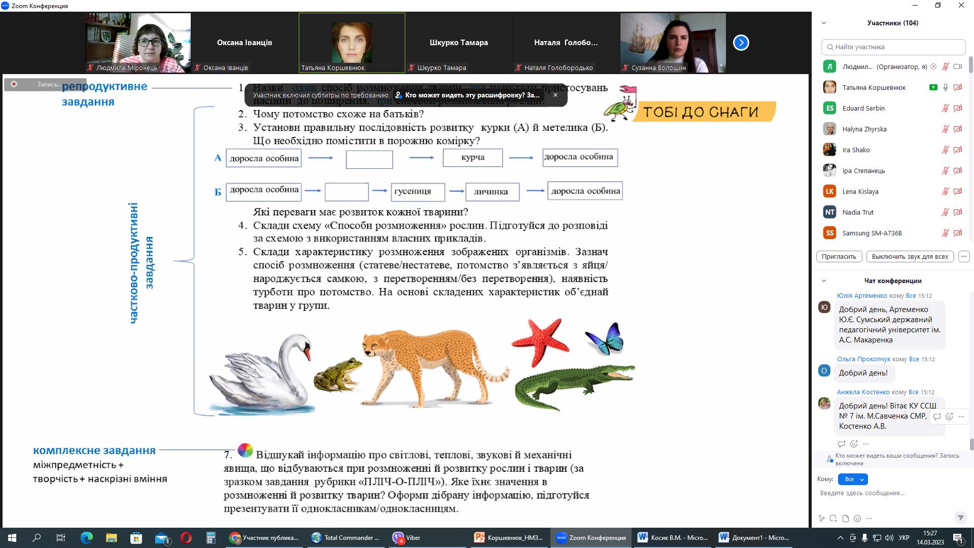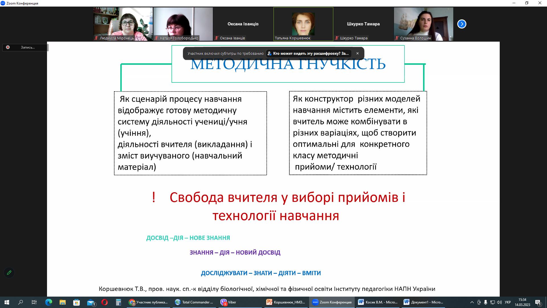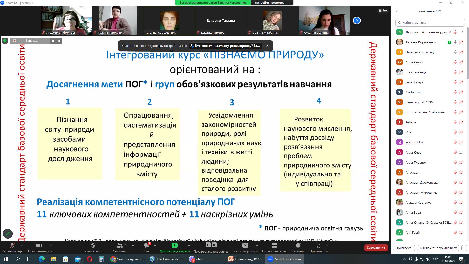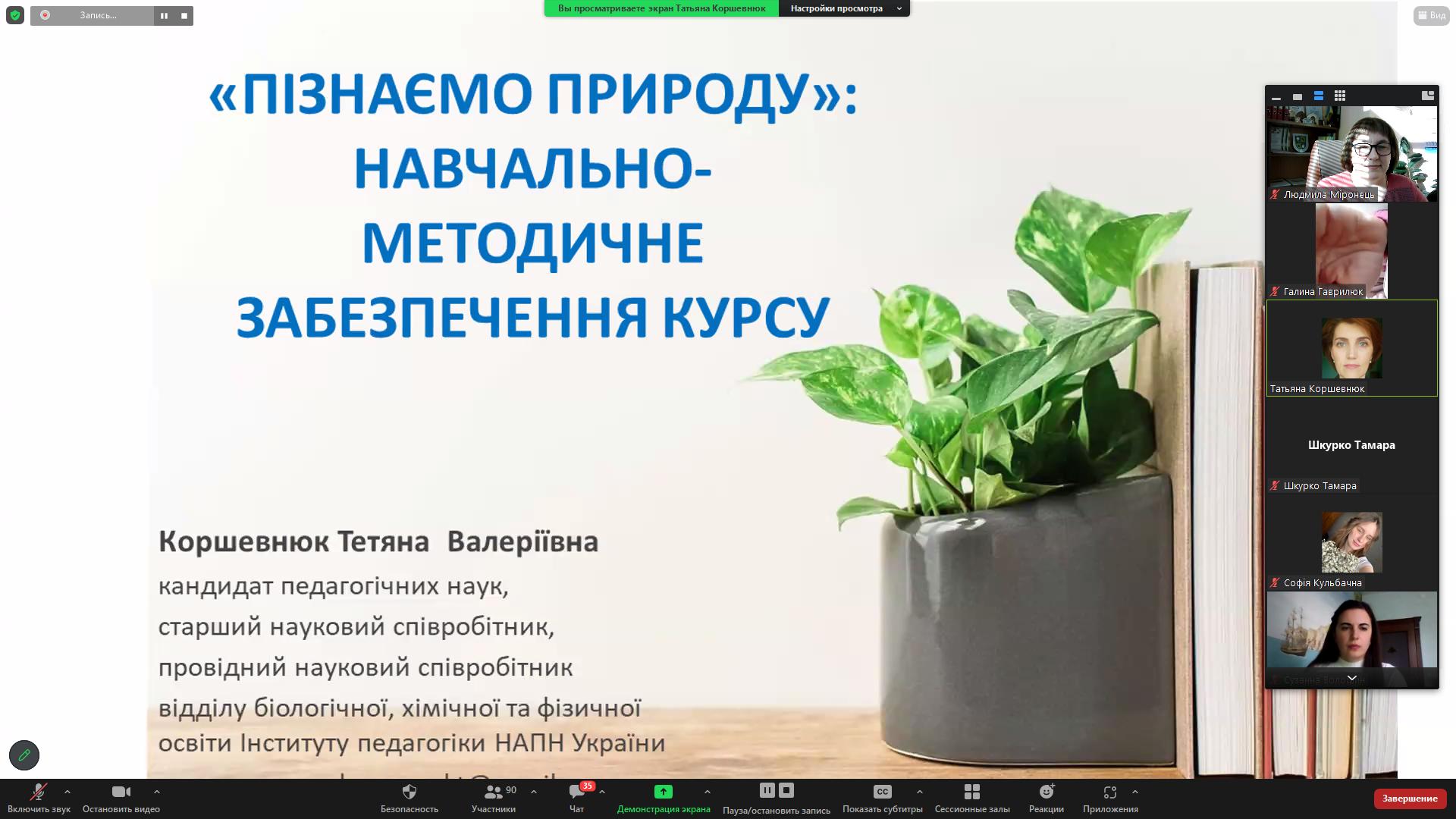 14 березня 2023 року серію вебінарів із авторами модельних програм та підручників для НУШ природничої освітньої галузі розпочала зустріч із Тетяною Валеріївною Коршевнюк, к.пед.н., старшим науковим співробітником, провідним науковим співробітником відділу біологічної, хімічної та фізичної освіти Інституту педагогіки НАПН України, однією із авторів модельної програми та підручника інтегрованого курсу «Пізнаємо природу».