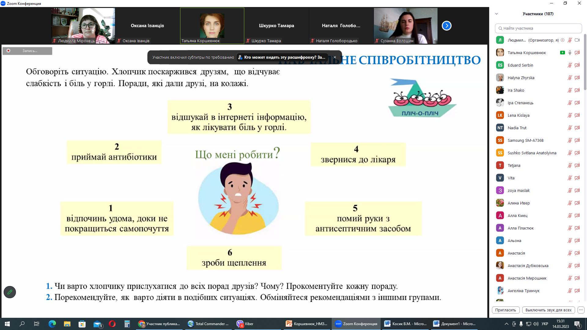 На етапі запитань та відповідей вчителі-практики та здобувачі вищої освіти задавали запитання авторці стосовно вивчення окремих тем курсу та термінів отримання друкованих матеріалів.