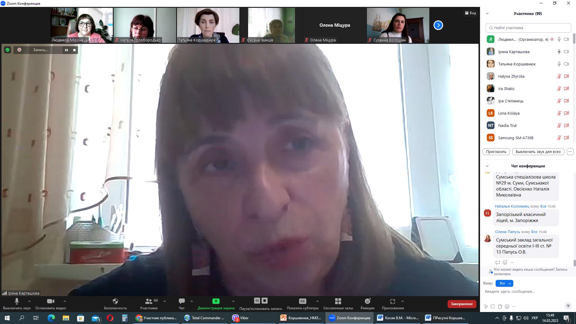 Враховуючи той факт, що СумДПУ імені А.С. Макаренка використовує ліцензійну версію платформи Zoom, кількість учасників онлайн зустрічей може бути до 1000 осіб. На цій зустрічі було більше 100 учасників. Приємно, що долучилися вчителі м. Суми, а також – Сумської, Дніпропетровської, Київської, Полтавської, Херсонської, Волинської та Житомирської областей. На вебінарі були присутні здобувачі освіти освітніх рівнів бакалавр та магістр спеціальностей 014 Середня освіта (Біологія та здоров’я людини), 014 Середня освіта (Географія), 014 Середня освіта (Хімія) природничо-географічного факультету СумДПУ імені А.С. Макаренка, Запорізького національного університету, Тернопільського національного педагогічного університету імені Володимира Гнатюка, Бердянського державного педагогічного університету, Полтавського національного педагогічного університету імені В. Г. Короленка, Херсонського державного університету, Волинського національного університету імені Лесі Українки, Дрогобицького державного педагогічного університету імені Івана Франка, Глухівського національного педагогічного університету імені Олександра Довженка та Рівненського державного гуманітарного університету.