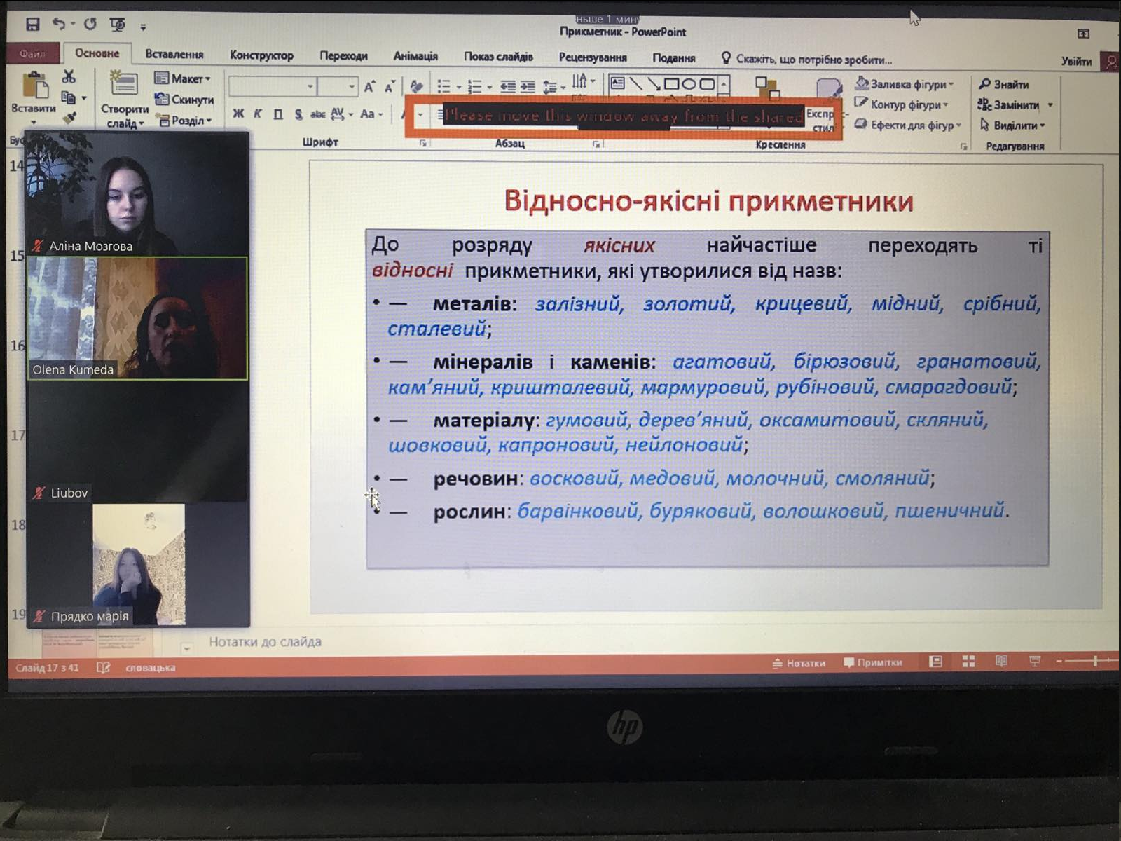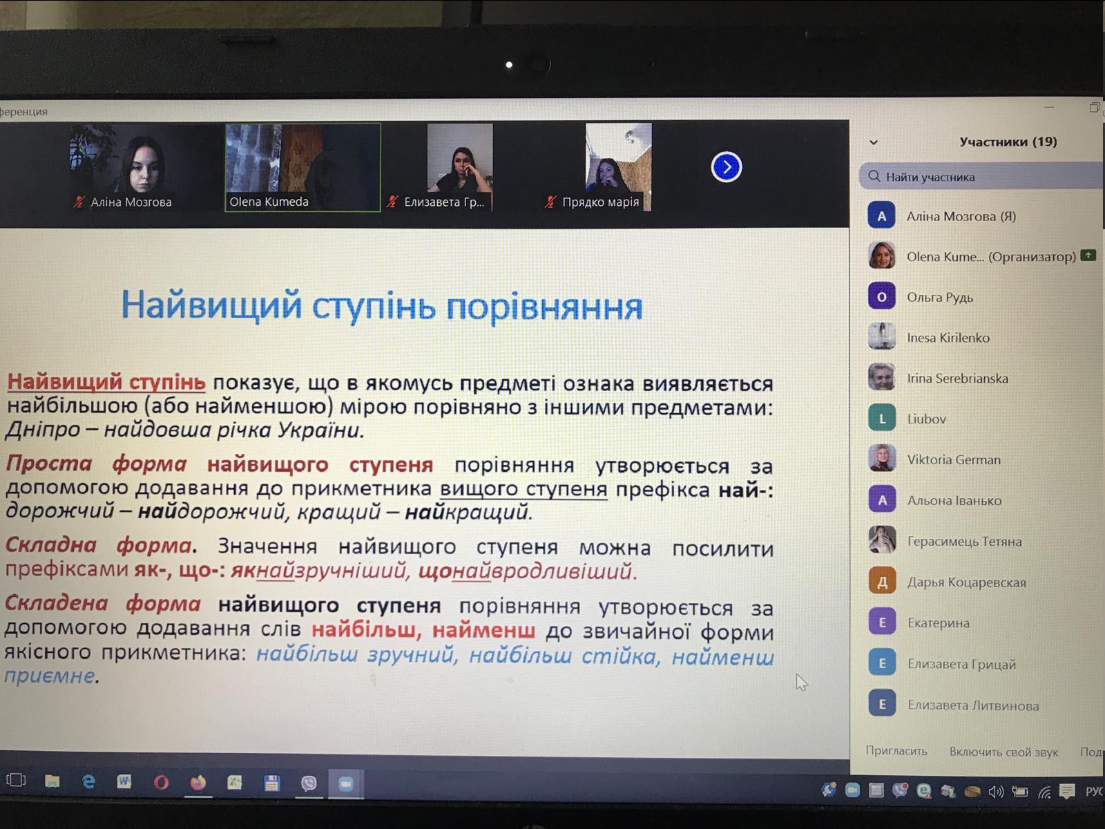 4.11.2020 в рамках Дня української писемності та мови відбулася відкрита лекція к.філол.н., доц. кафедри української мови та літератури Олени Павлівни Кумеди. Заняття із сучасної української літературної мови, присвячене темі «Прикметник», зібрало аудиторію з викладачів і студентів. Олена Павлівна цікаво й різнобічно висвітлила питання прикметникових форм в площині інтердисциплінарних зв’язків. Зокрема, пропонований матеріал торкнувся й історії української літературної мови, й історичної граматики, й діалектології. З лекції студенти почерпнули нову інформацію про визначних вітчизняних мовознавців, окремі віхи розвитку української лінгвістики, значно поглибили знання про прикметник як повнозначну частину мови.