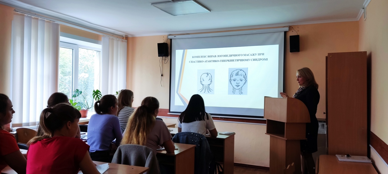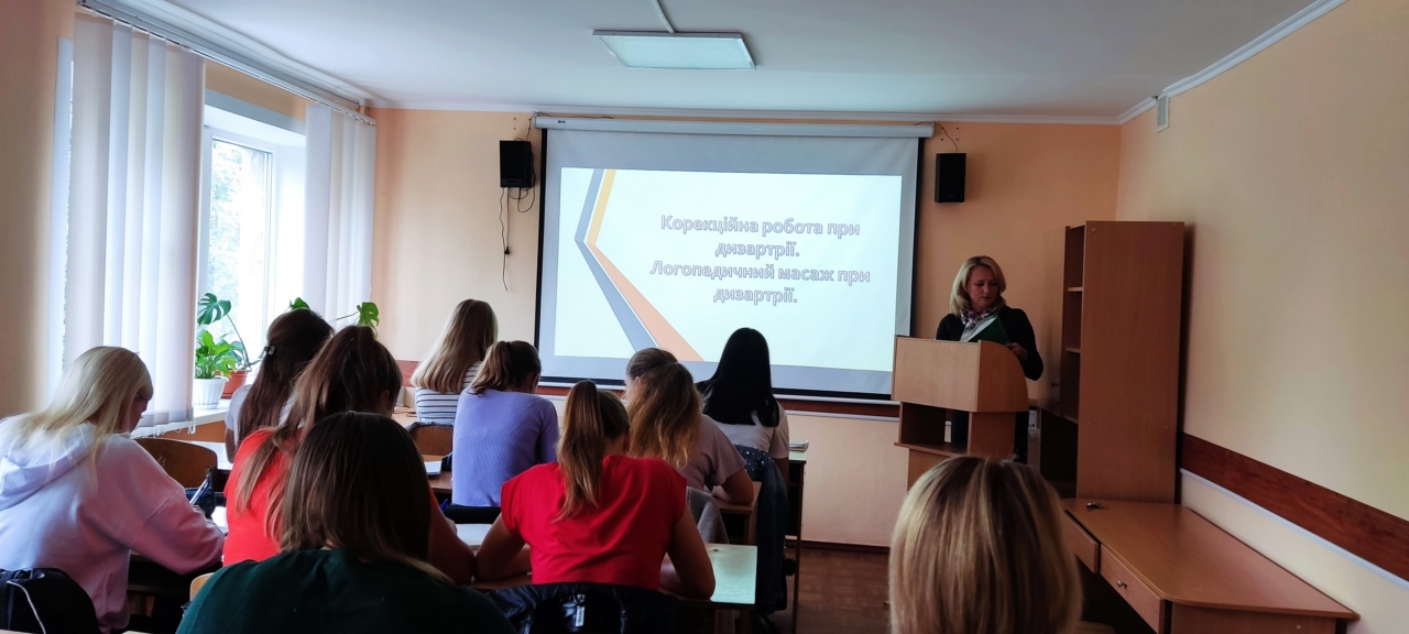 Логопедичний масаж при дизартрії». Упродовж заняття було ґрунтовно висвітлено посутні аспекти корекційних заходів, спрямованих на подолання цього тяжкого мовленнєвого розладу, й окреслено шляхи доцільного використання теоретичного та практичного матеріалу в професійній діяльності логопеда. Змістовна і логічно структурована лекція переконливо засвідчила високий рівень фахової підготовки, науковий підхід до проблеми, методичну грамотність і педагогічну культуру лекторки.