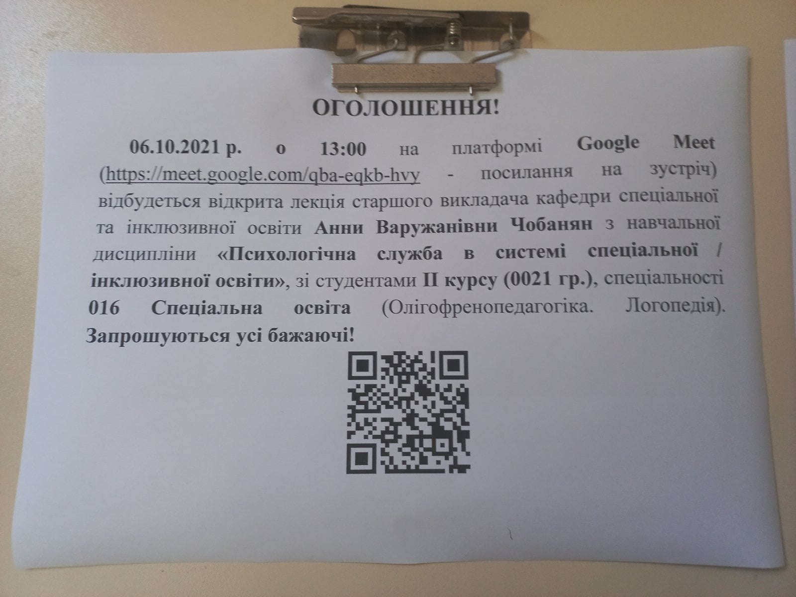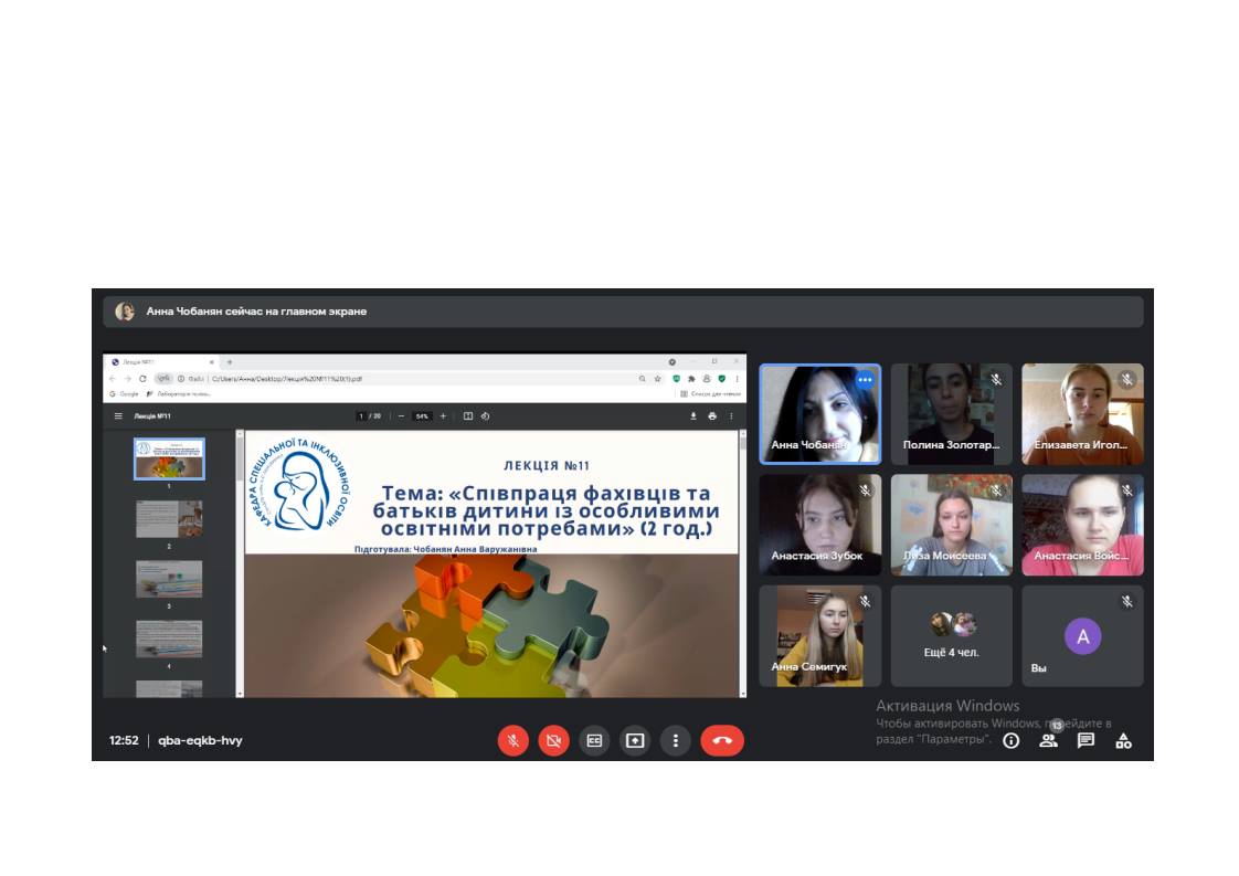 06.10.2021 року відбулася відкрита лекція старшого викладача кафедри спеціальної та інклюзивної освіти СумДПУ ім. А.С. Макаренка Анни Варужанівни Чобанян зі студентами II курсу (0021 гр.) спеціальності 016 Спеціальна освіта (Олігофренопедагогіка. Логопедія), на тему «Співпраця фахівців та батьків дитини із особливими освітніми потребами» в межах освітнього компоненту «Психологічна служба в системі спеціальної / інклюзивної освіти».